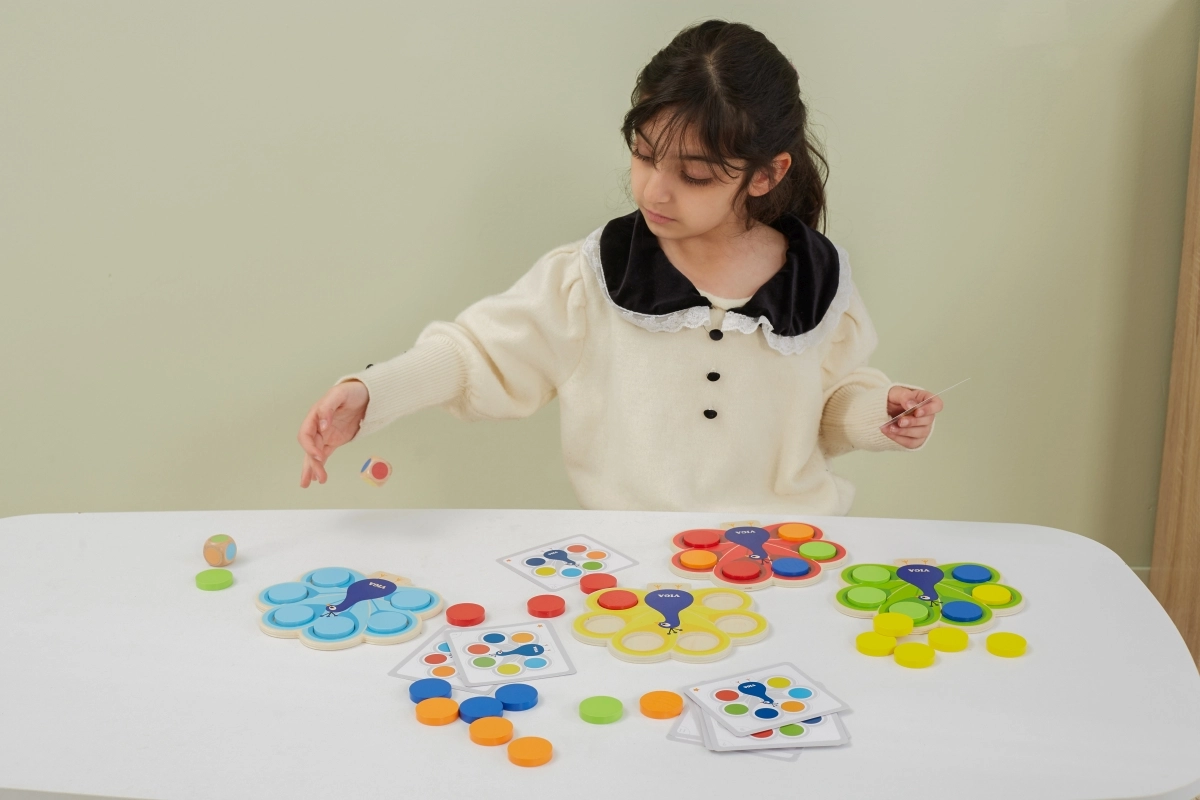 Bērni saskaņo ripuļus pēc kartītēm vai metiena ar kauliņu, dabiski apgūst krāsas un trenē uzmanību un loģiku.