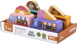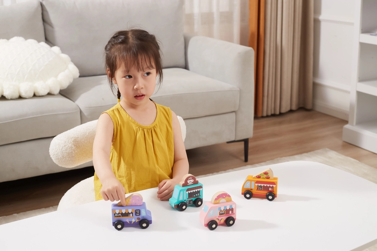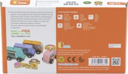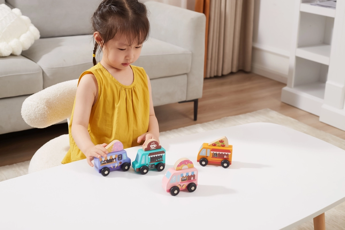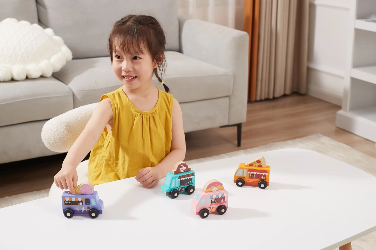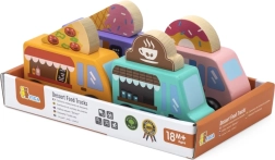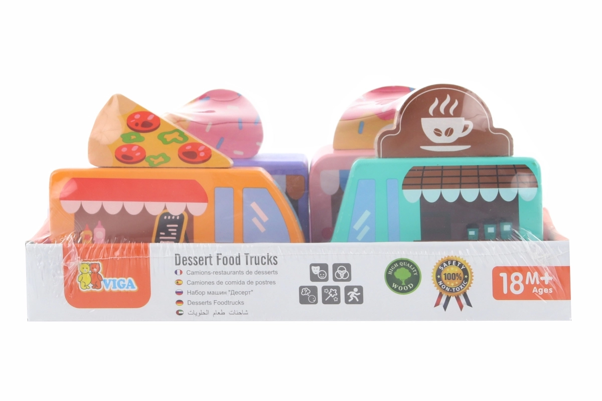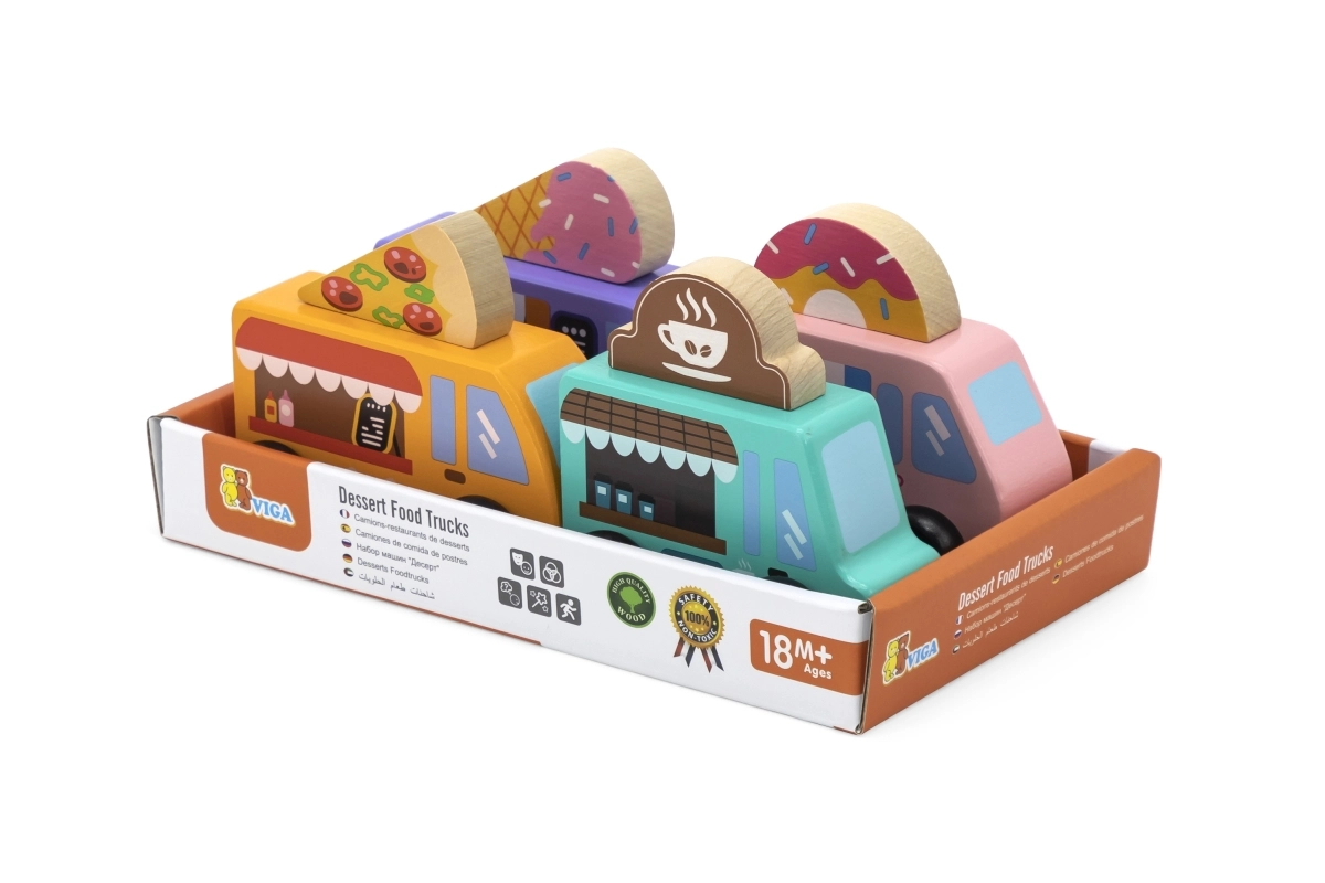 Viga koka food truck komplekts piedāvā četrus mīlīgus transportlīdzekļus uz riteņiem pasteļtoņos ar detalizētiem apdrukas elementiem. Katram auto ir tematiska izkārtne – pica, kafija, saldējums un virtuļi – ko var brīvi samainīt, ļaujot bērniem veidot savus stāstus un iestādes. Kvalitatīvs koks un netoksiskas krāsas nodrošina drošu un ilgmūžīgu izklaidi.