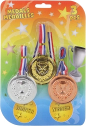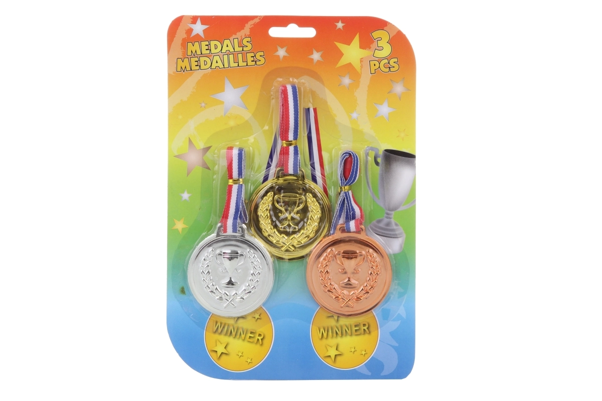 Šis universālais medaļu komplekts ir lieliska motivācija visiem mazajiem sportistiem un spēlētājiem. Kvalitatīvs izpildījums un trīs klasiskās krāsas ļauj apbalvot uzvarētājus un citus godalgotos jebkurās sacensībās. Pateicoties aptuveni 6 cm diametram, medaļas ir labi pamanāmas un ērti nēsājamas.