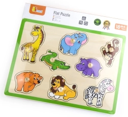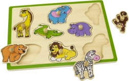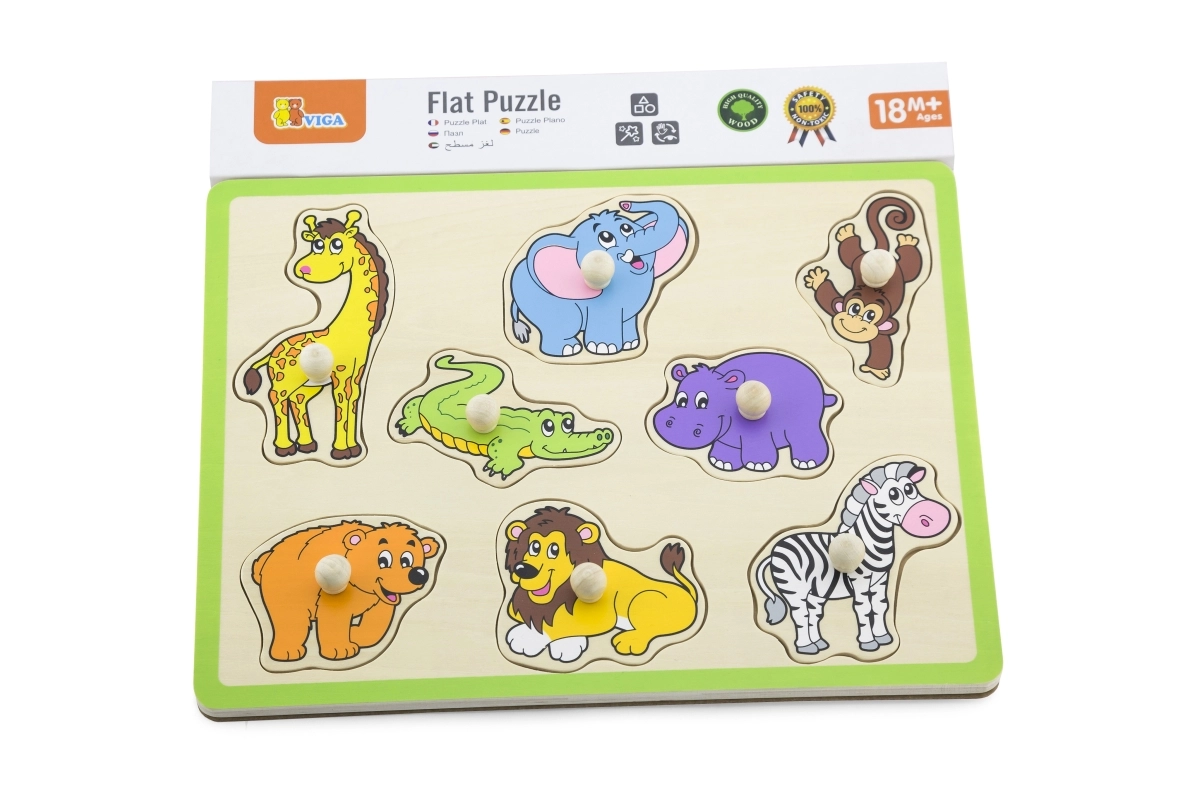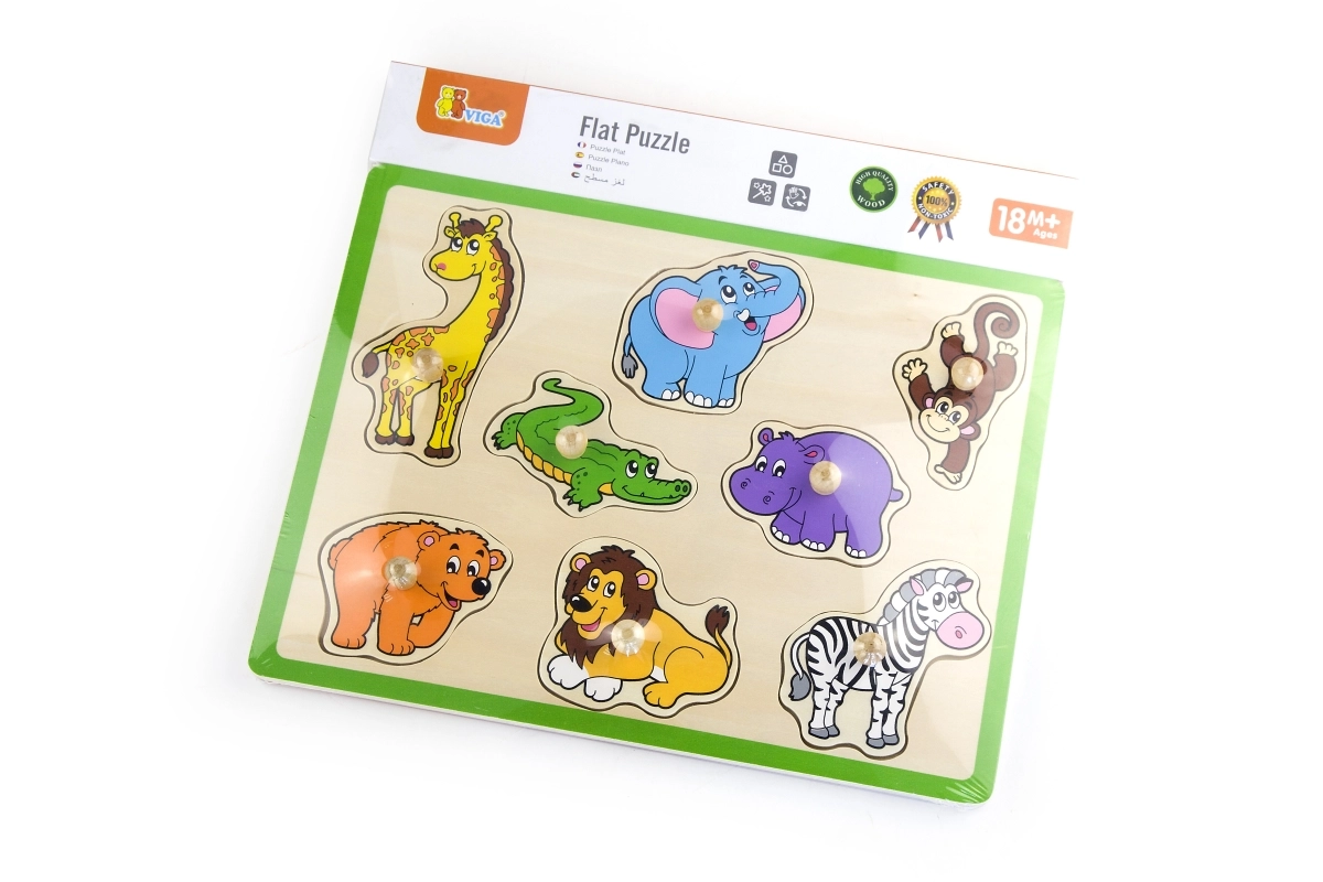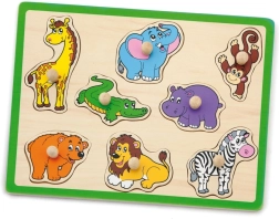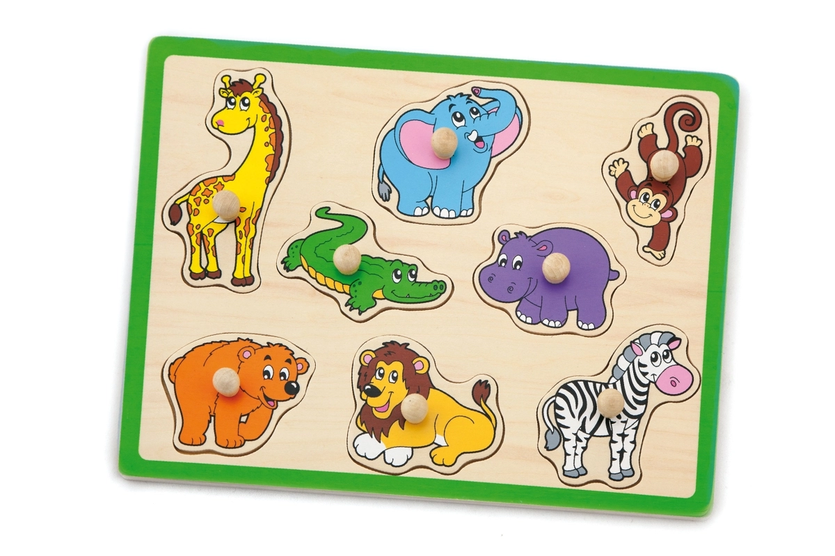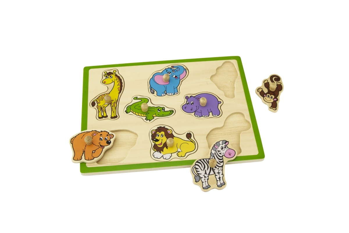 Šī kvalitatīvā koka ielikņu rotaļlieta ar džungļu motīvu sniedz bērniem prieku atklāt dzīvniekus, piemēram, žirafi, ziloni, krokodilu, lauvu un zebru. Katrai detaļai ir praktisks koka rokturis ērtai satveršanai un precīzai ievietošanai atbilstošajā formā. Izturīgā plāksne ar izteiktu zaļu malu ir noturīga un labi turas gan uz galda, gan uz paklāja.