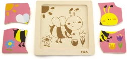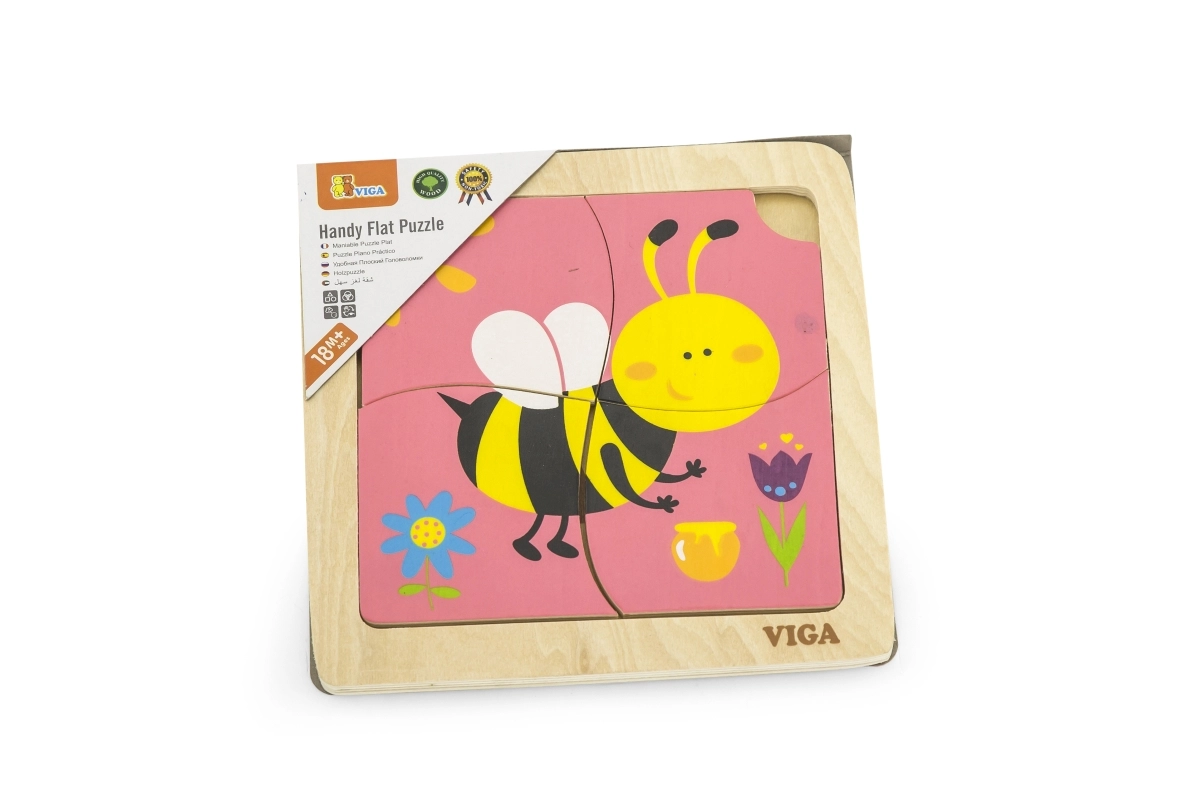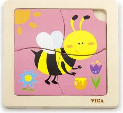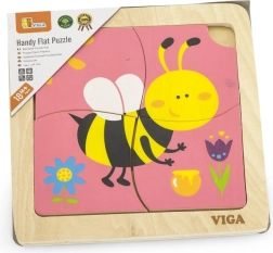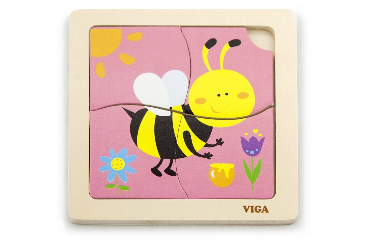 Puzle satur 4 gabaliņus ar bites motīvu, kas tiek salikti attēlā uz pamatnes.
