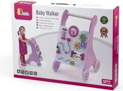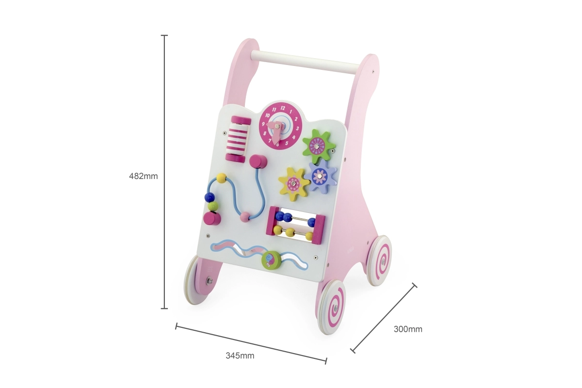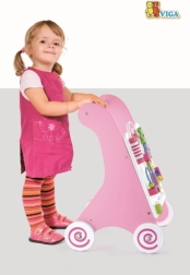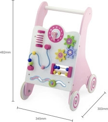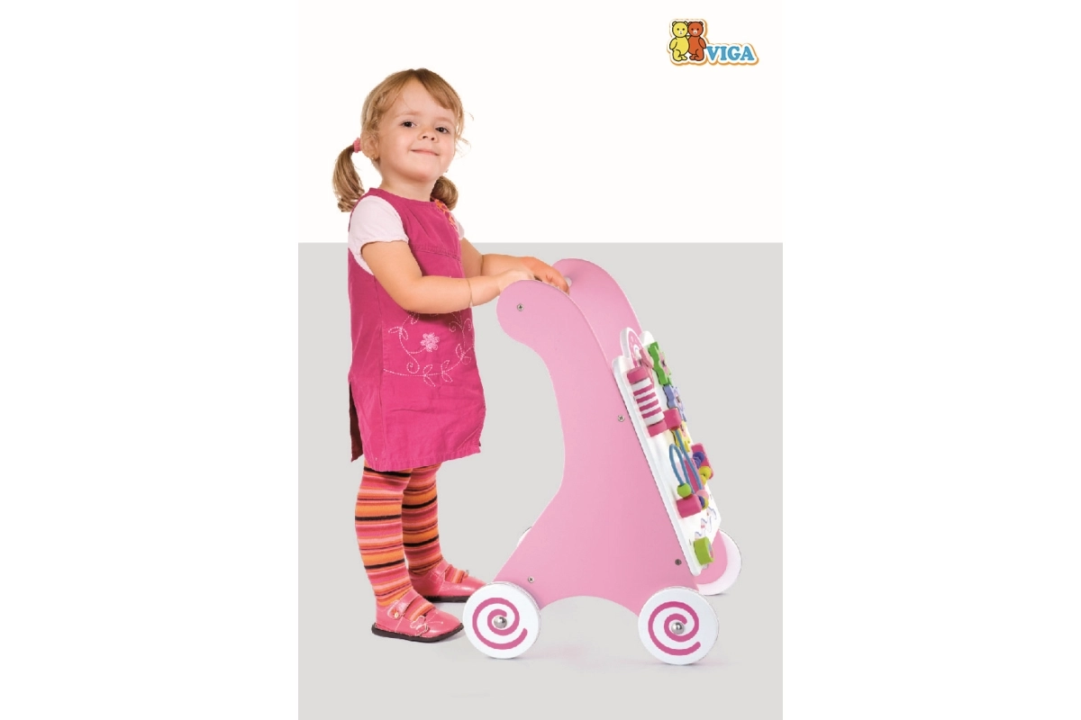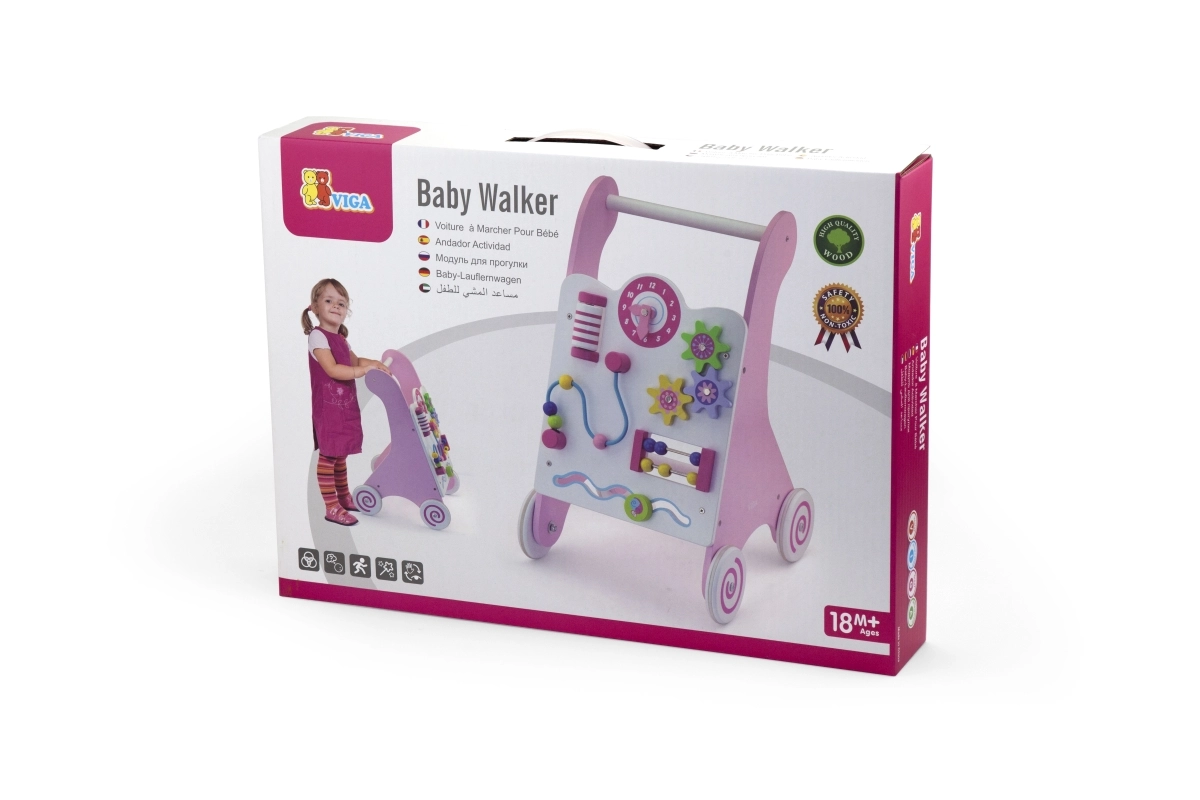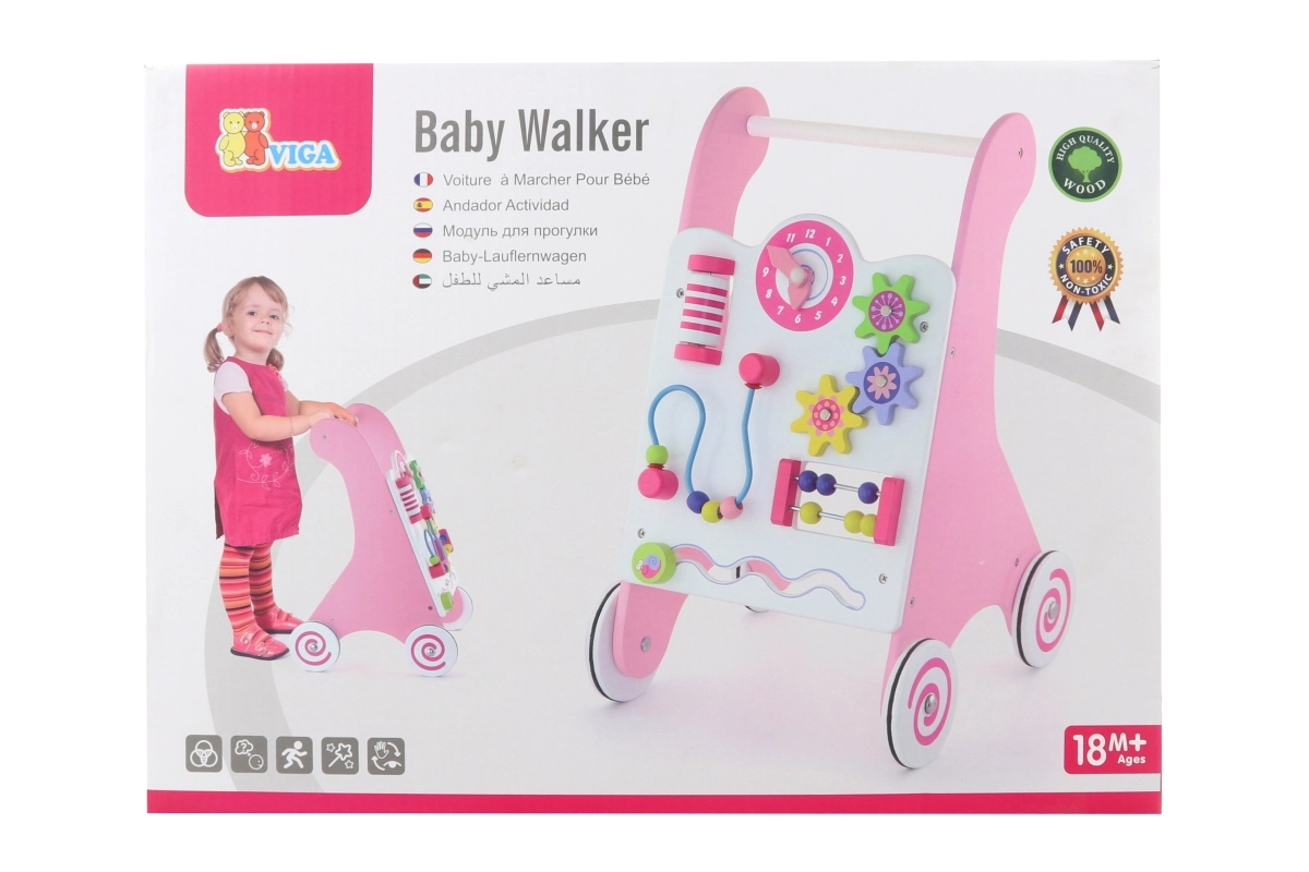 Staigulis ir aprīkots ar gumotām ritenīšiem, kas novērš slīdēšanu un nodrošina drošību pastaigas laikā. Visa rotaļlieta ir izgatavota no lakota koka, kas nodrošina siltu un dabisku pieskārienu, vienlaikus ir ļoti izturīga pret nolietojumu. Iepakots krāsainā kastē ar rokturiem, tas ir ideāli piemērots dāvanai.