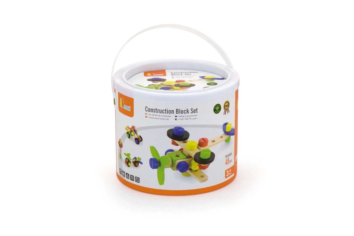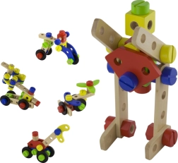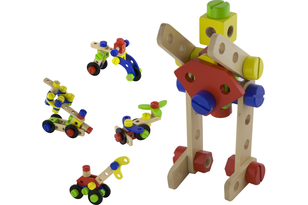 Šis koka konstruktora komplekts ir lieliska izvēle pirmajai tehniskajai būvēšanai. Bērni var veidot savus darbus pēc fantāzijas vai iedvesmoties no pievienotās brošūras ar attēlu pamācībām. Kompaktais spainītis ar rokturi atvieglo pārnēsāšanu un glabāšanu, tāpēc komplekts vienmēr ir pa rokai un detaļas nepazūd.