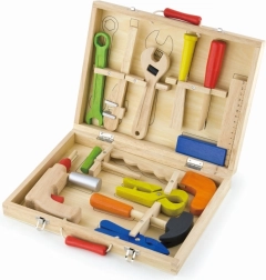 Praktisks koka instrumentu komplekts izturīgā koferītī mazajiem meistariem no 3 gadiem. Ietver 12 detaļas (urbis, āmurs, zāģis, atslēga, skrūvgriezis u.c.), kas attīsta smalko motoriku, radošumu un spēli meistara lomā. Kompakti izmēri apm. 31,5 × 24 × 6 cm, metāla aizdares un sarkans rokturis ērtai pārnēsāšanai.