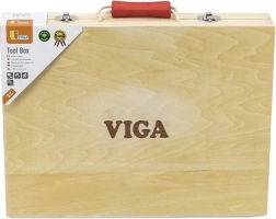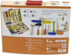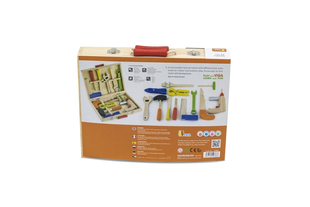 Šis kvalitatīvais koka instrumentu komplekts no VIGA sniedz bērniem reālistisku pieredzi darbā ar rīkiem. Košie un izturīgie priekšmeti, piemēram, urbis, āmurs, skrūvgriezis, atslēga un zāģis, veicina iztēli un piedāvā drošu veidu, kā attīstīt veiklību un acu–roku koordināciju.