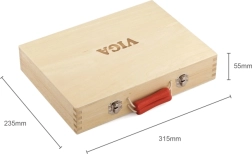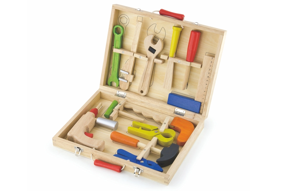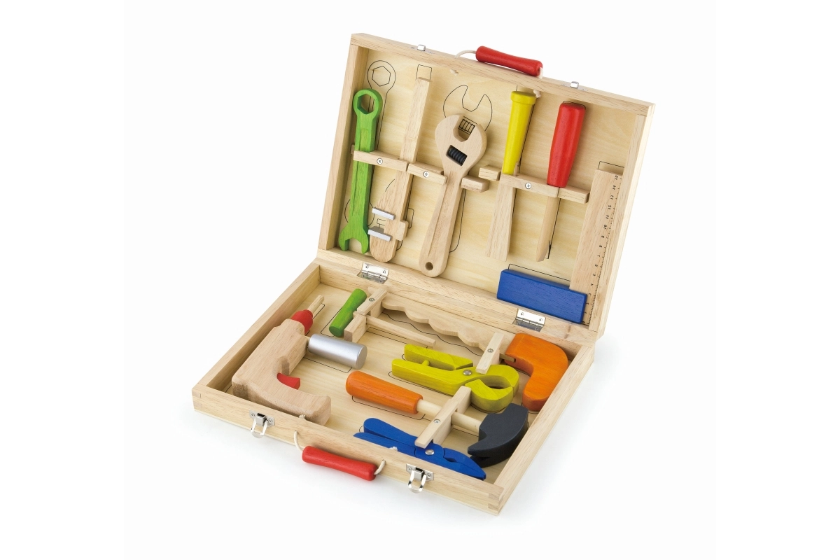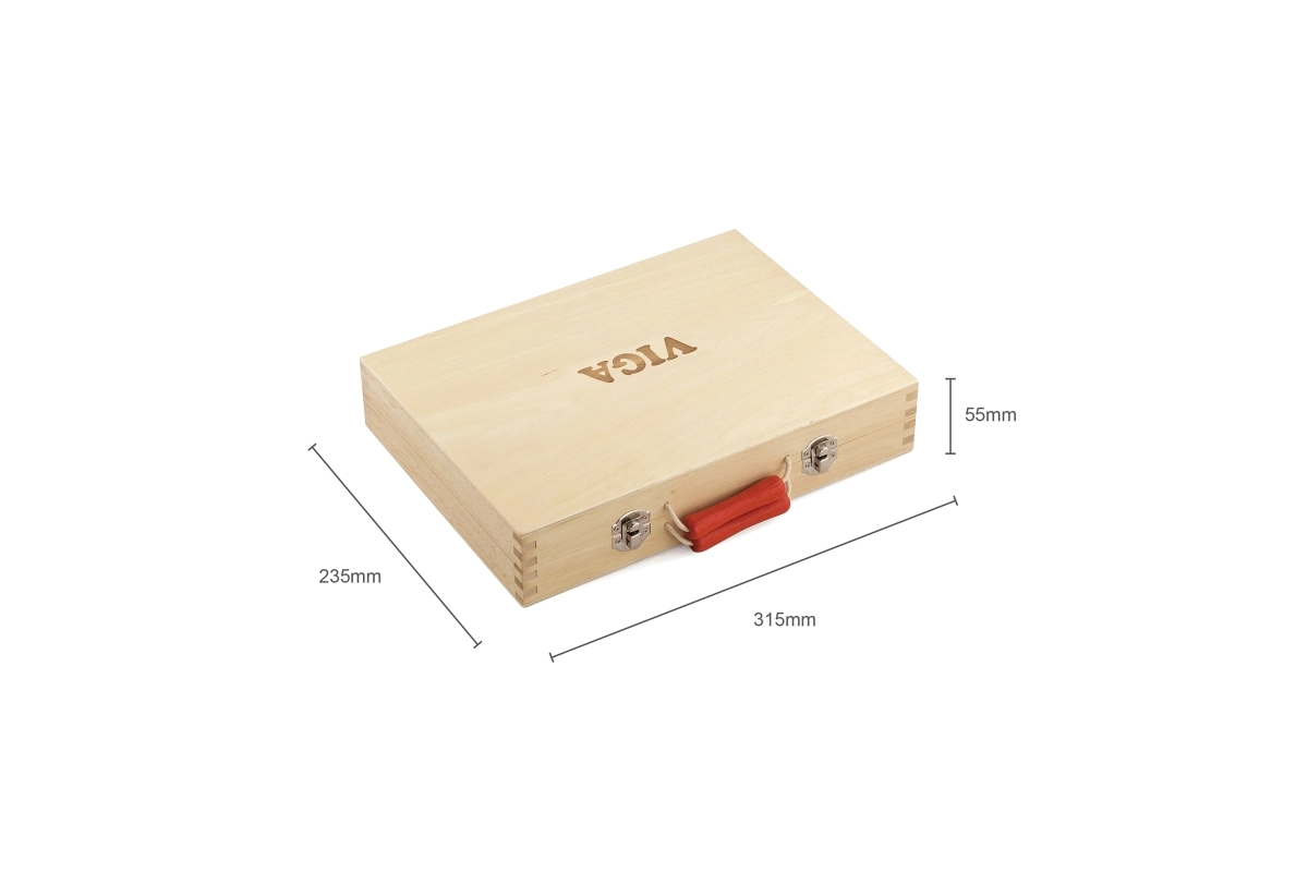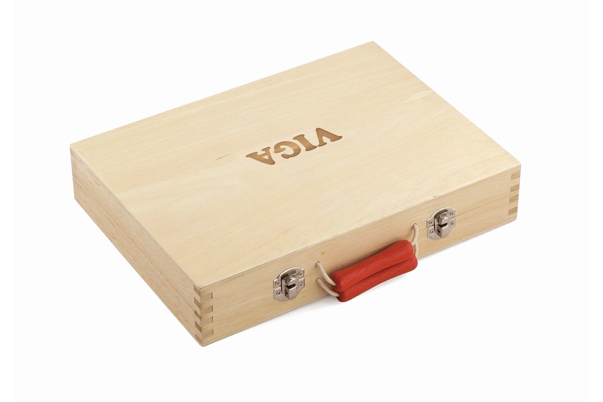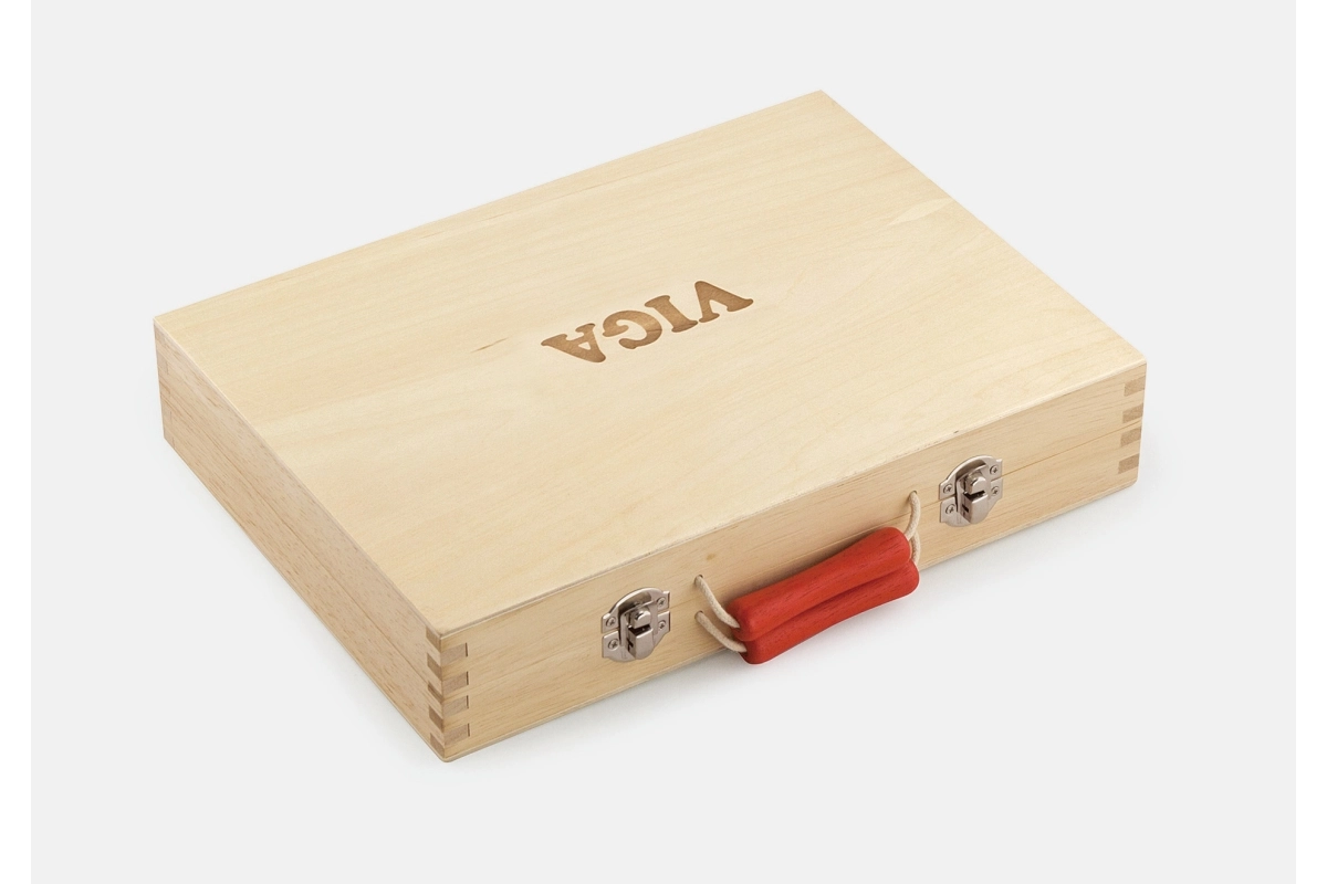 Izturīgais koka koferītis ar metāla aizdarēm un sarkanu rokturi nodrošina, ka viss paliek savā vietā, tāpēc nekas nepazūd. Pateicoties pārskatāmajai iekšējai kārtībai, katram rīkam ir sava vieta, un visu komplektu ir viegli paņemt līdzi ciemos, ceļā vai turēt bērnistabā.
