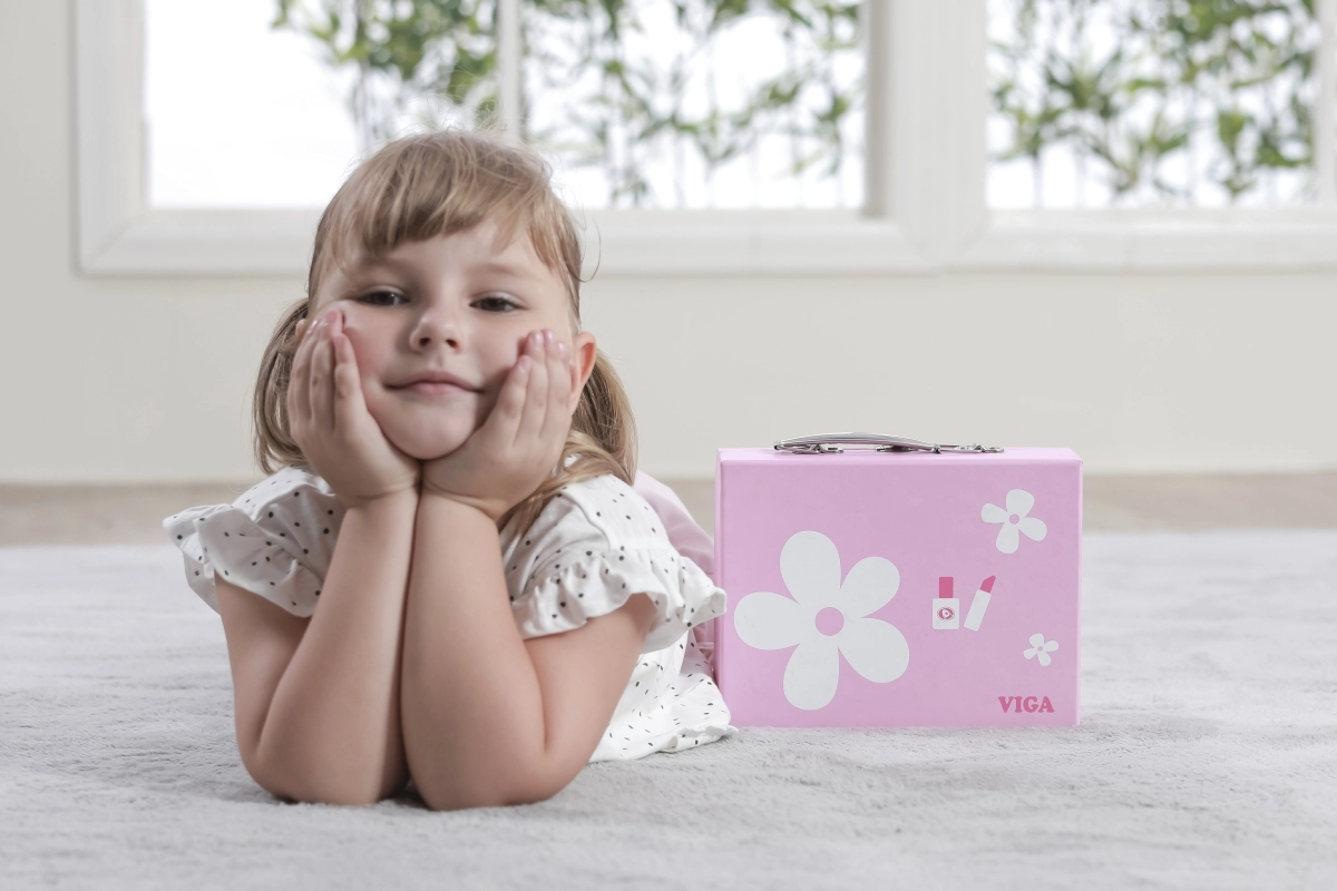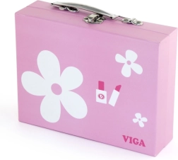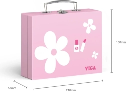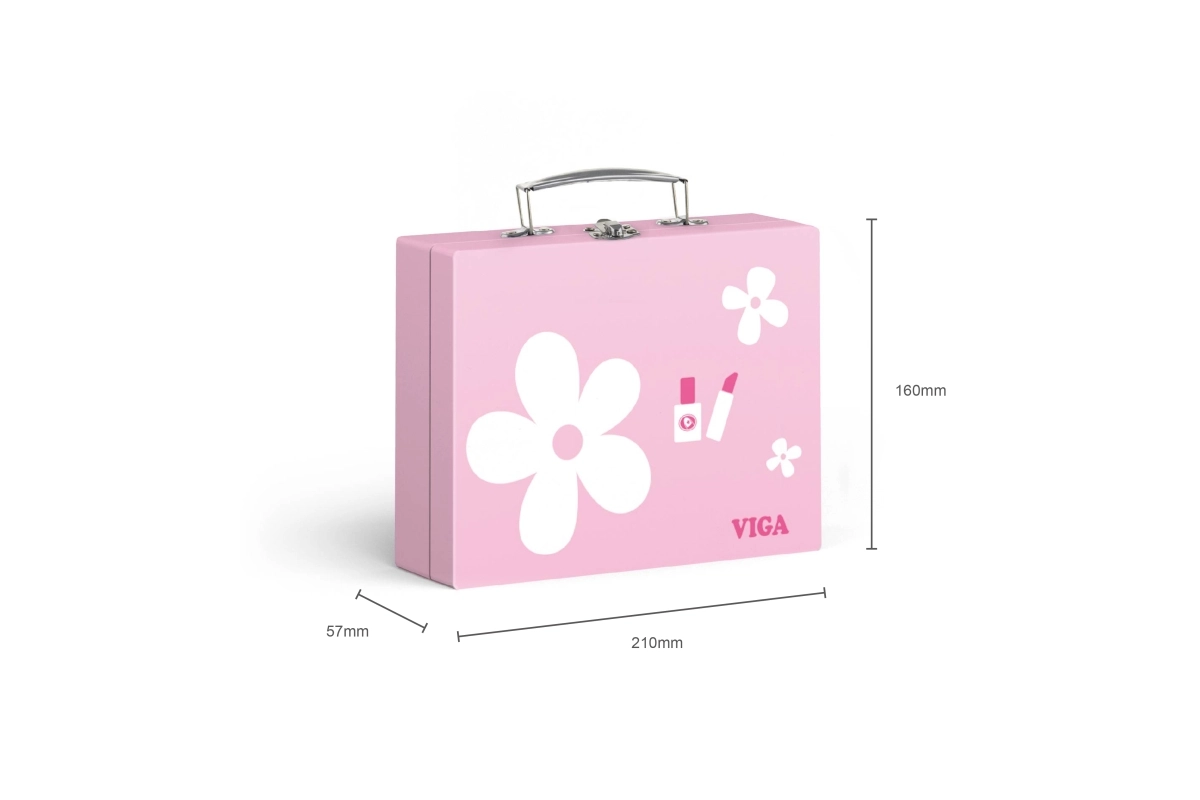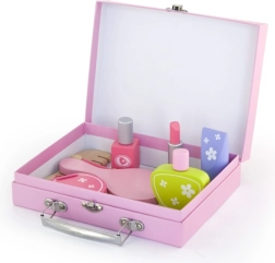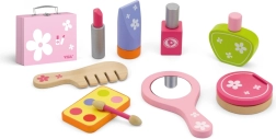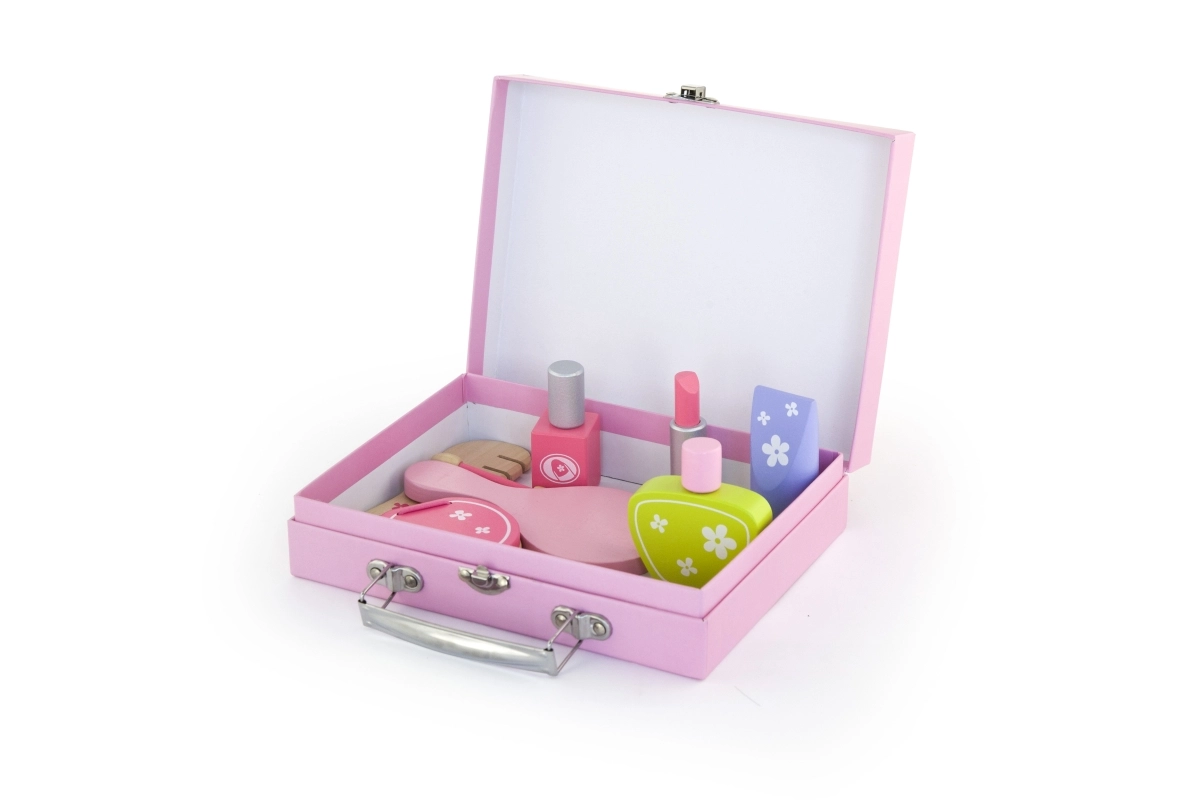 Stilīgs koka skaistumkopšanas komplekts mazajiem modes cienītājiem praktiskā koferītī iepriecinās ikvienu bērnu no 3 gadu vecuma. Tas ietver visu reālistiskai skaistumkopšanas salona spēlei – ķemmi, spogulīti, nagu laku, lūpu krāsu, smaržas un citus piederumus. Pateicoties izturīgam kokam un gludi apstrādātām detaļām, spēle ir droša un ilgnoturīga. Attīsta iztēli, sīko motoriku un sociālās prasmes.
