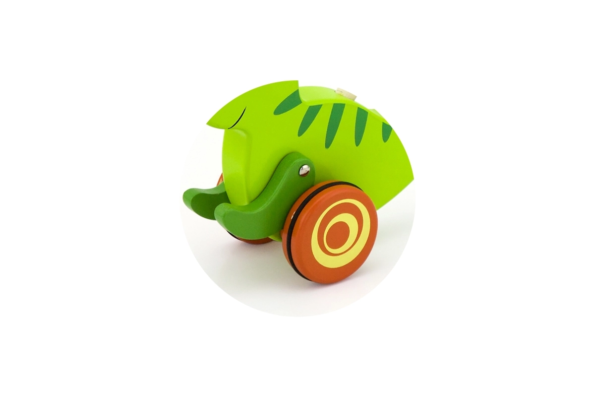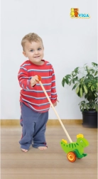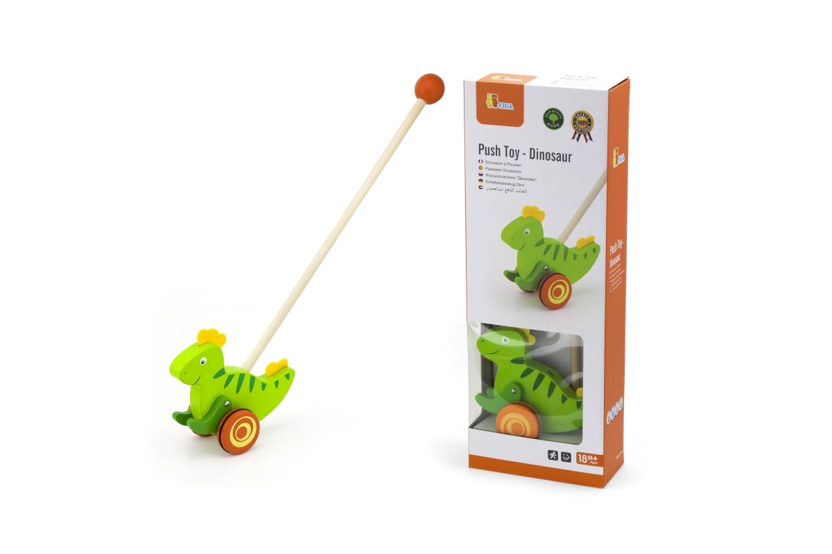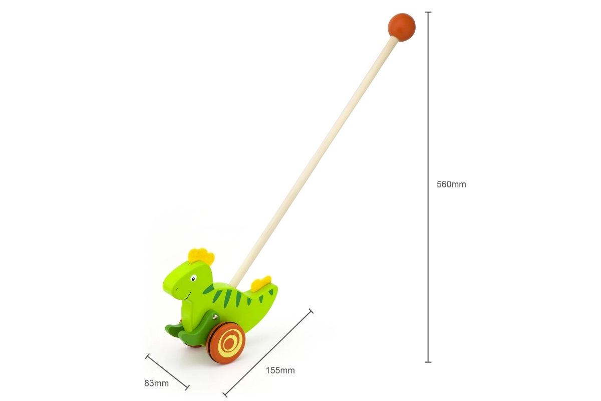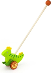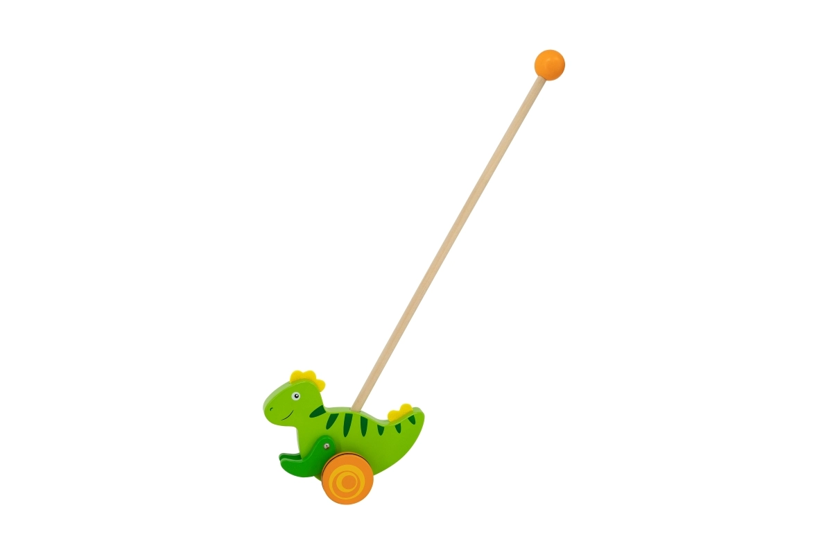 Koka stumjamā rotaļlieta Dinozaurs ir klasiskā rotaļlieta, kas paredzēta bērniem, kuri sāk kustēties. Šis izturīgais piederums ir aprīkots ar riteņiem un pret-slīdes uzlikām, kas aizsargā grīdu un atvieglo pārvietošanos. Zaļais dinozaurs enerģiski kustina rokas stumšanas laikā, piesaistot uzmanību un motivējot bērnu turpināt kustību.