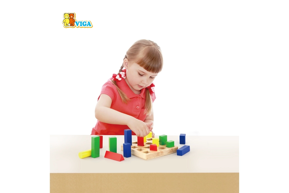 Bērni šķiro un ievieto krāsainus ģeometriskus gabaliņus pareizajās vietās, dabiski apgūstot formas un krāsas.
