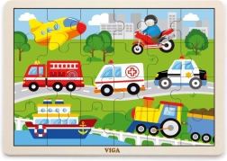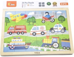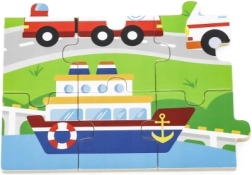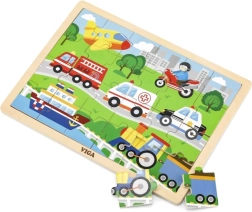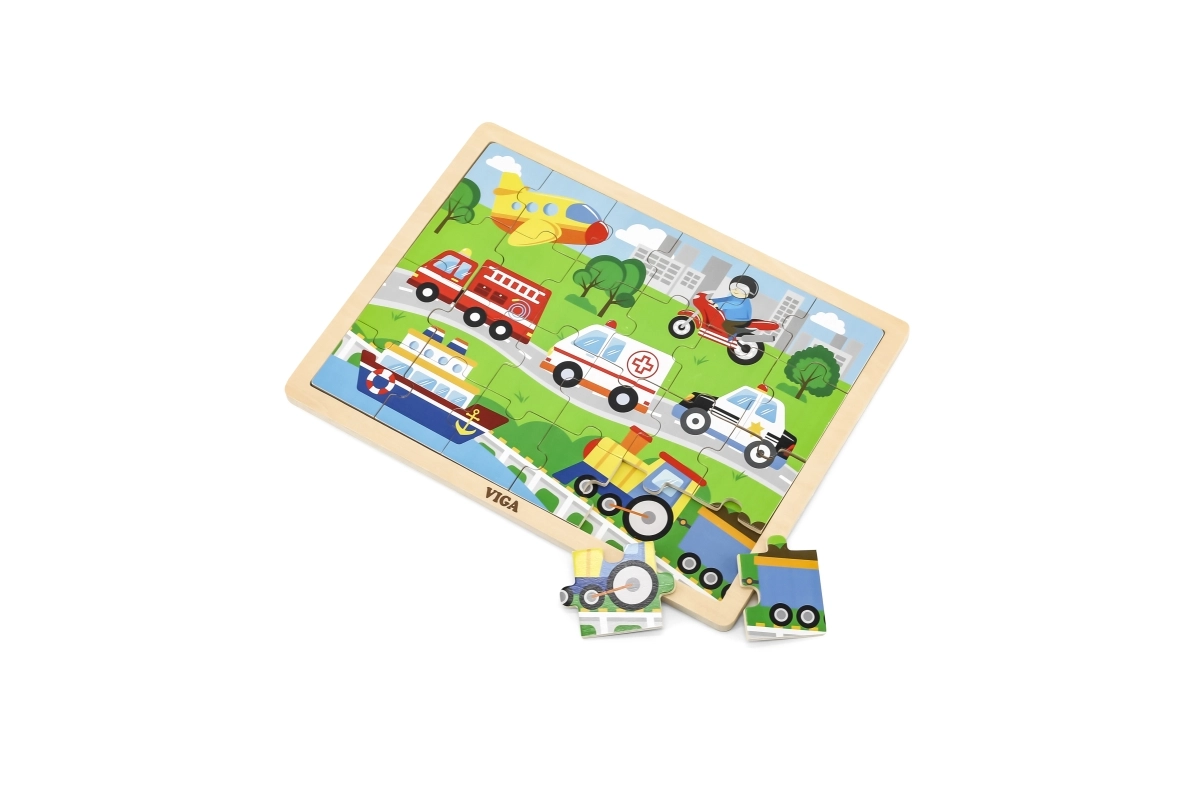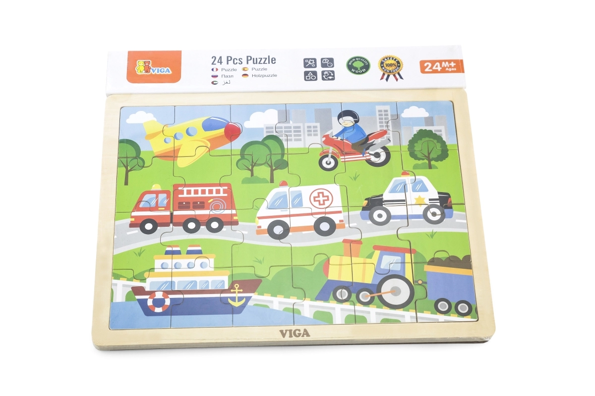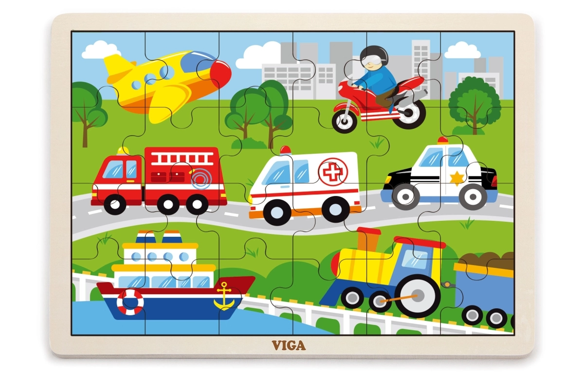 Šī koka puzle ar transportlīdzekļu attēliem ir lieliska izvēle pirmajai “lielākajai” puzlei. Pateicoties 24 gabaliņiem, salikšana sniedz tieši tik daudz izaicinājuma, cik vajadzīgs – tā veicina koncentrēšanos un prieku par pabeigtu attēlu aptuveni 27,5 × 20 cm izmērā. Krāsainās ilustrācijas (ātrā palīdzība, ugunsdzēsēju auto, policijas auto, kuģis, lidmašīna u.c.) dabiski iedvesmo bērnus spēlēties atkārtoti.