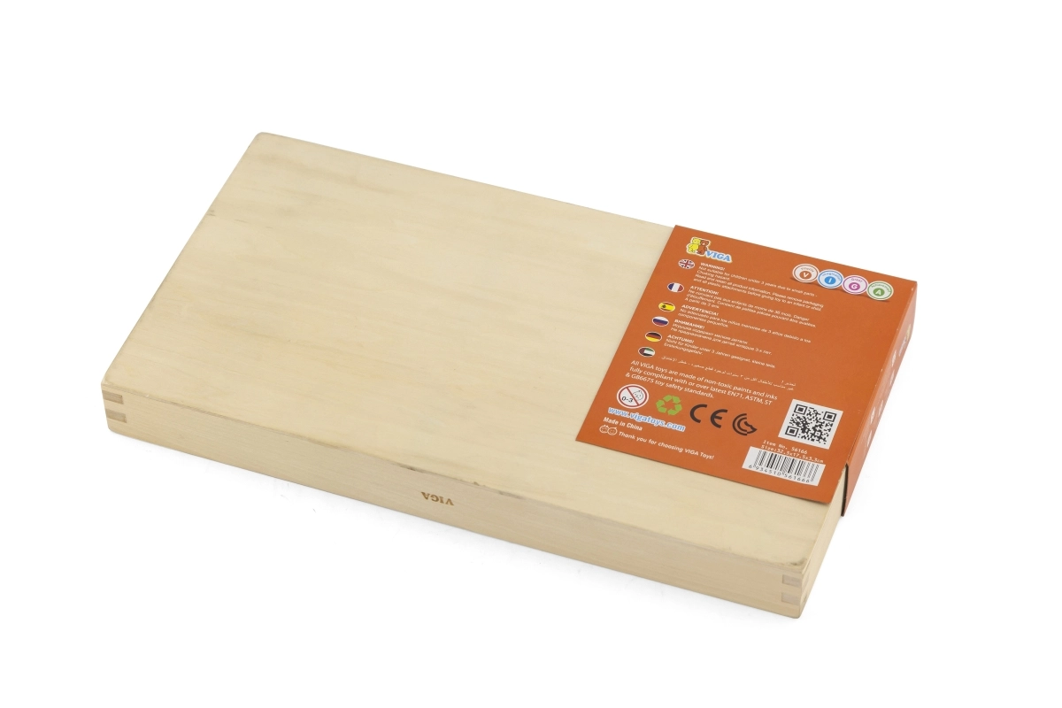 Nūjiņas ir izgatavotas no lakota koka un krāsotas ar drošām, netoksiskām krāsām. Izturīgā koka kastīte ar nodalījumiem uztur kārtību un atvieglo uzglabāšanu pēc spēles.