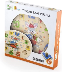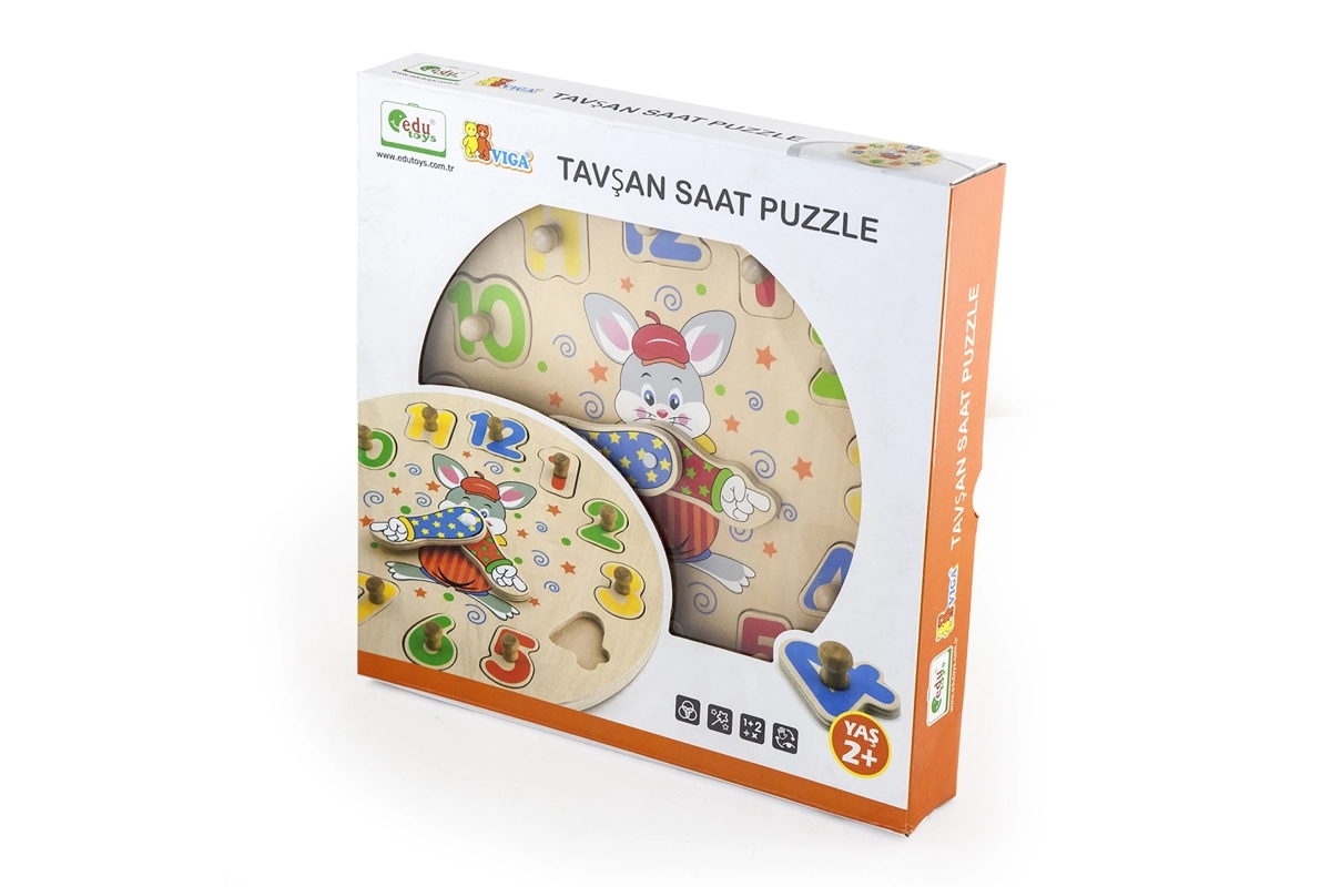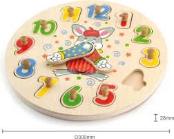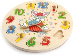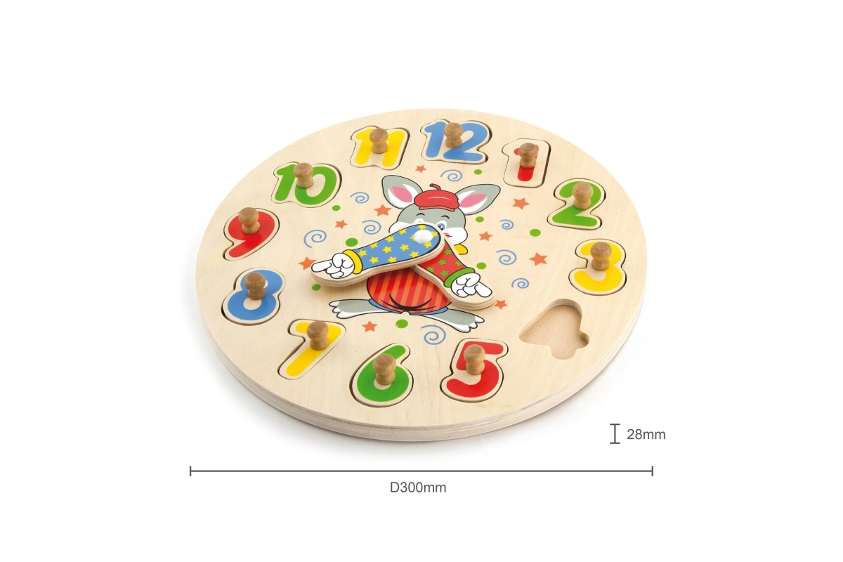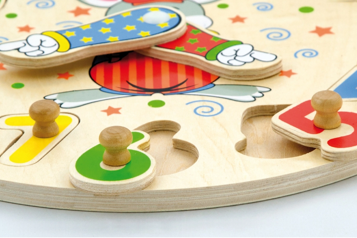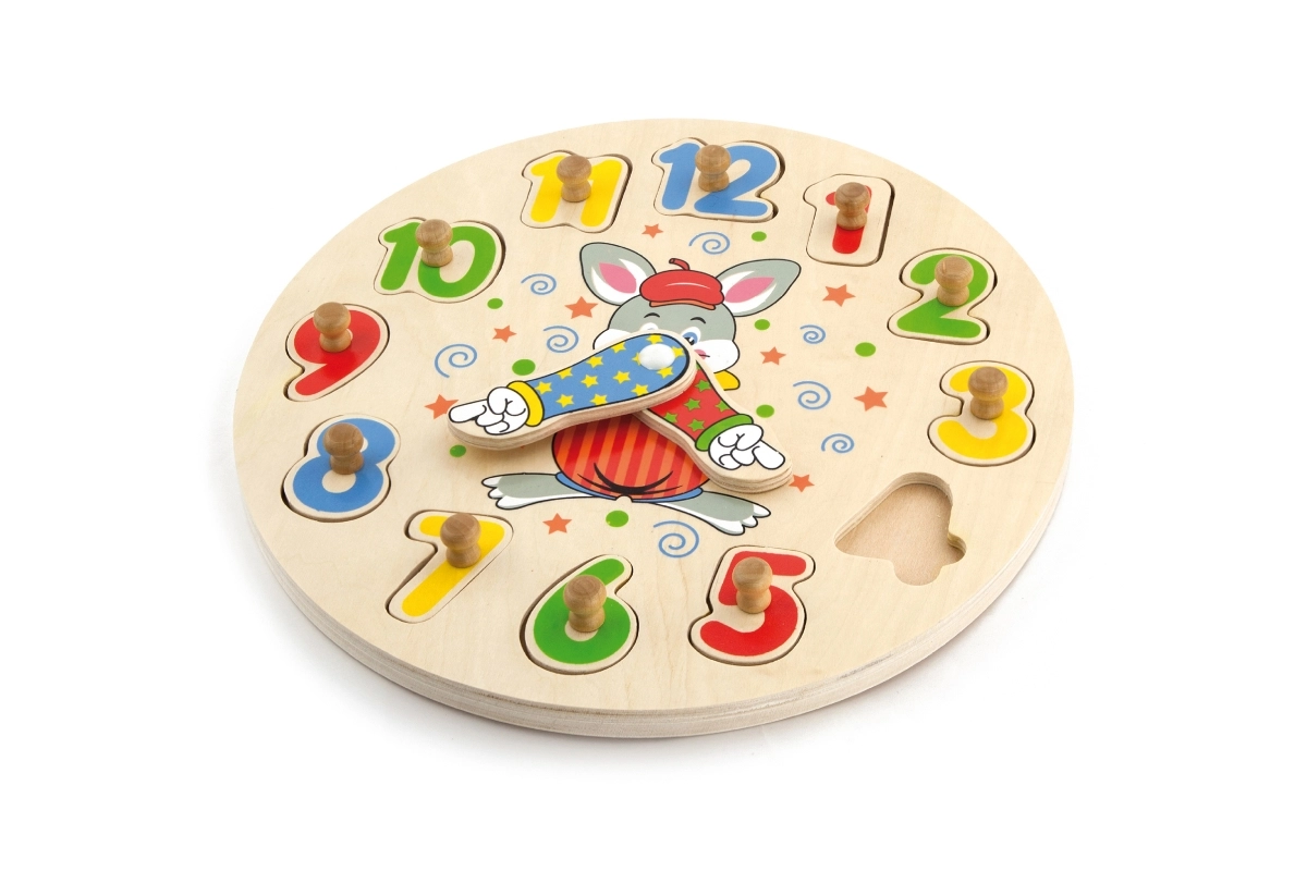 Šis koka pulkstenis apvieno ieliekamo puzli ar laika apguvi. Krāsainās, numurētās detaļas ar praktiskiem rokturiem lieliski der mazām bērnu rokām un palīdz apgūt ciparus 1–12. Salikšanas laikā bērni trenē pacietību, acu–roku koordināciju, kā arī formu un krāsu uztveri.