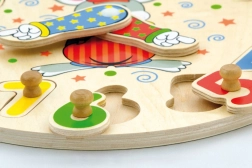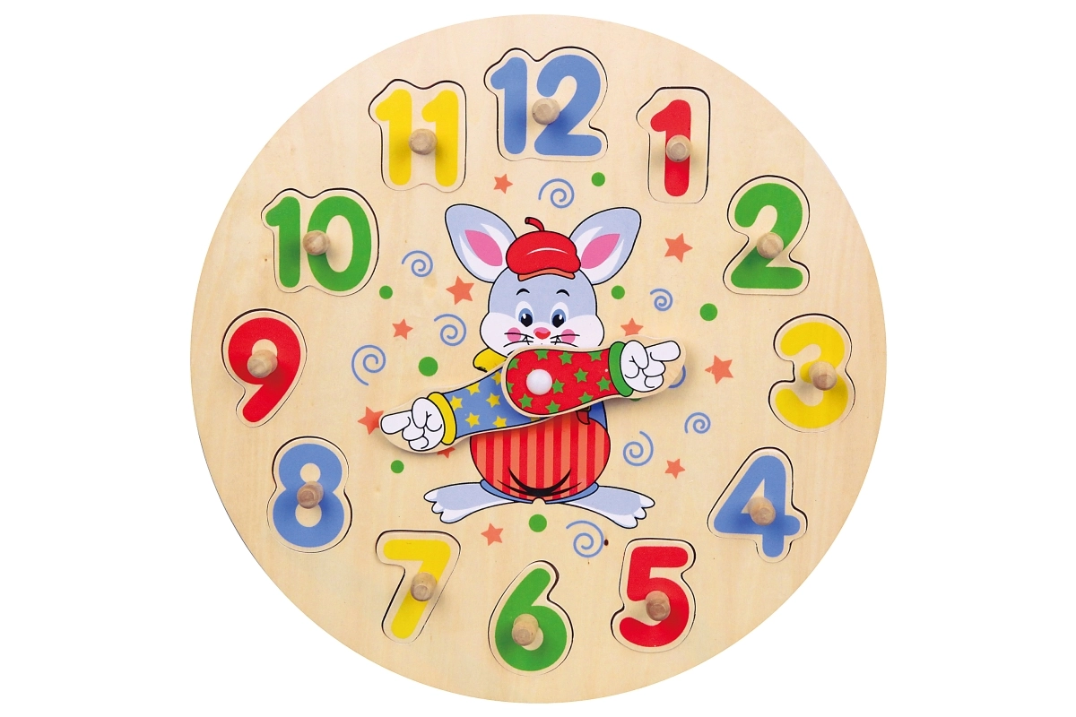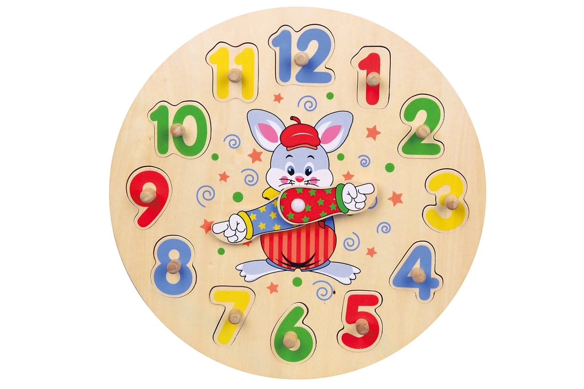 Izklaidējošs un drošs koka mācību pulkstenis, kas kalpo arī kā ieliekamā puzle. Bērni ar 12 krāsainām detaļām ar rokturiem vingrina ciparus 1–12 un apgūst laika noteikšanas pamatus, attīsta sīko motoriku, loģisko domāšanu un krāsu un formu atpazīšanu. Diametrs apm. 30 cm, piemērots no 24 mēnešiem.