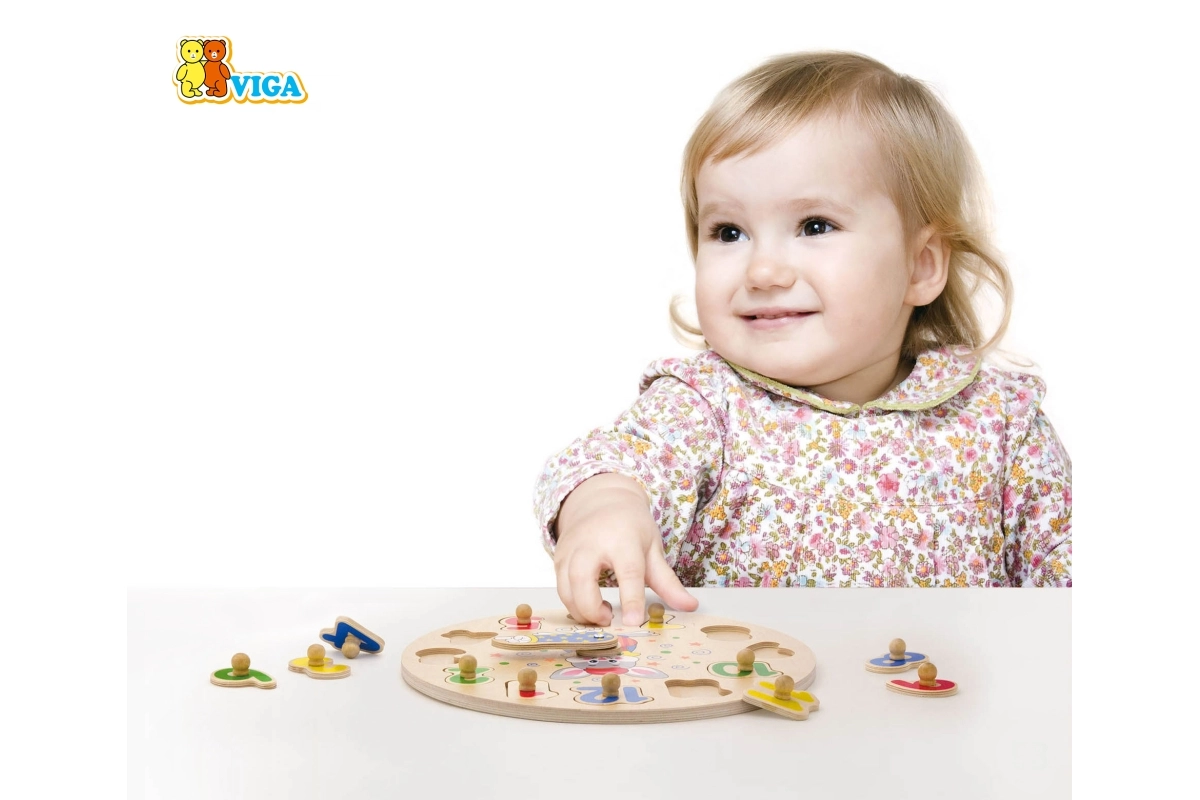 Katrai detaļai ir koka pogveida rokturis ērtai satveršanai. Saliekot bērni trenē sīko motoriku un acu–roku koordināciju.