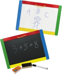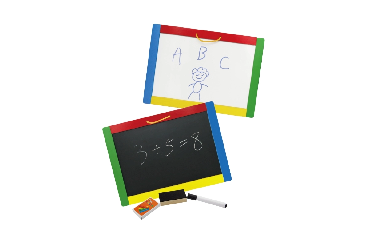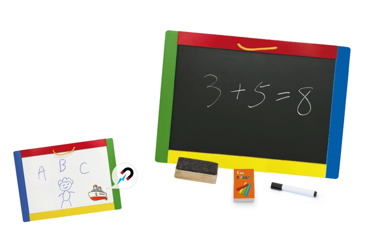 Šī universālā tāfele apvieno divas radošas virsmas vienā – melna magnētiskā puse krītiņiem un balta noslaukāma puse flomāsteram. Bērni var rakstīt, zīmēt un trenēt burtus un ciparus; pie melnās puses viegli pielikt magnētiņus. Komplektā atradīsiet visu tūlītējai lietošanai: 4 krītiņus, noslaukāmu flomāsteru un sūklīti.