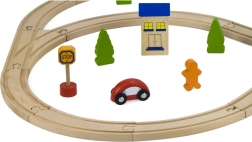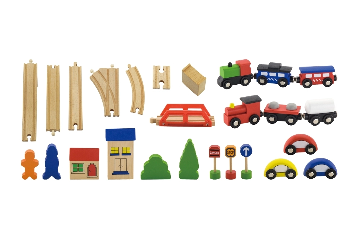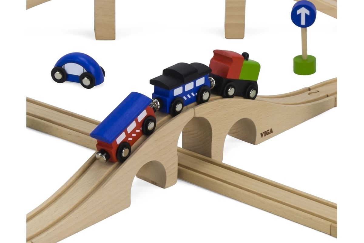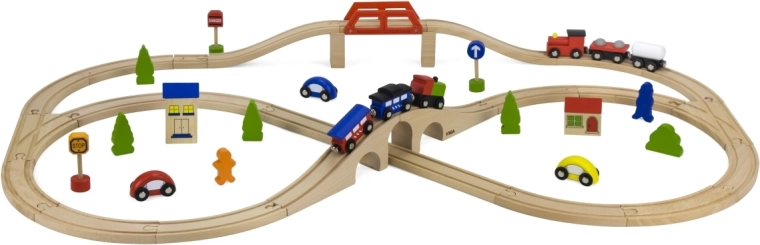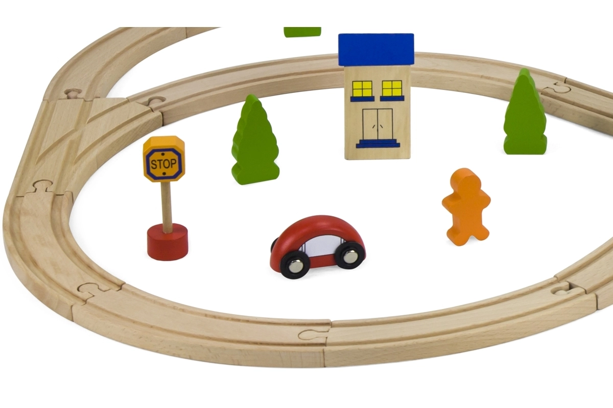Uzbūvējiet savu pasauli uz sliedēm! Koka vilciena trase ar daudzveidīgu trases garumu un izkārtojumu ļauj bērniem veidot dažādas maršrutus, šķērsot tiltus un savienot transportu ar pilsētu, pateicoties iekļautajām mašīnītēm un aksesuāriem. Kvalitatīvais koka apstrādājums ir izturīgs un patīkams rokai.