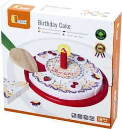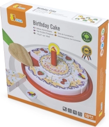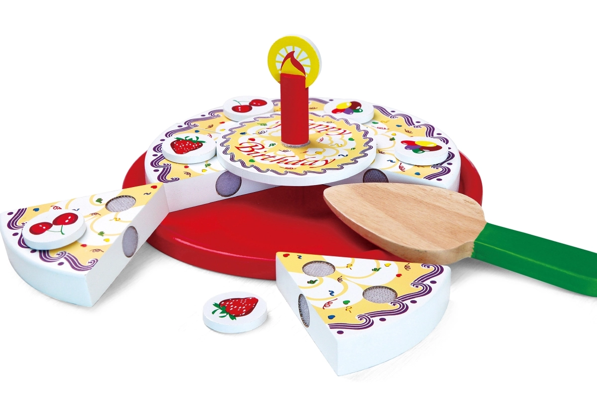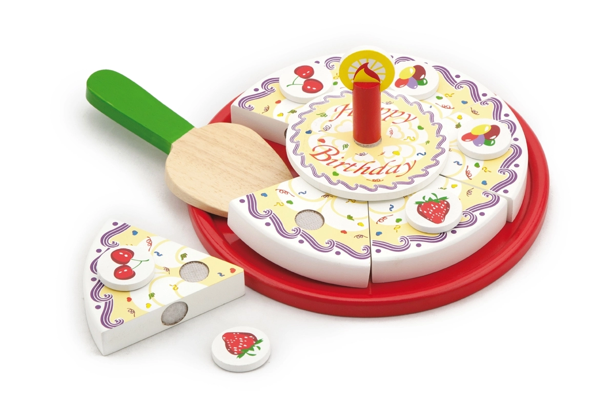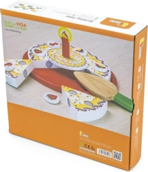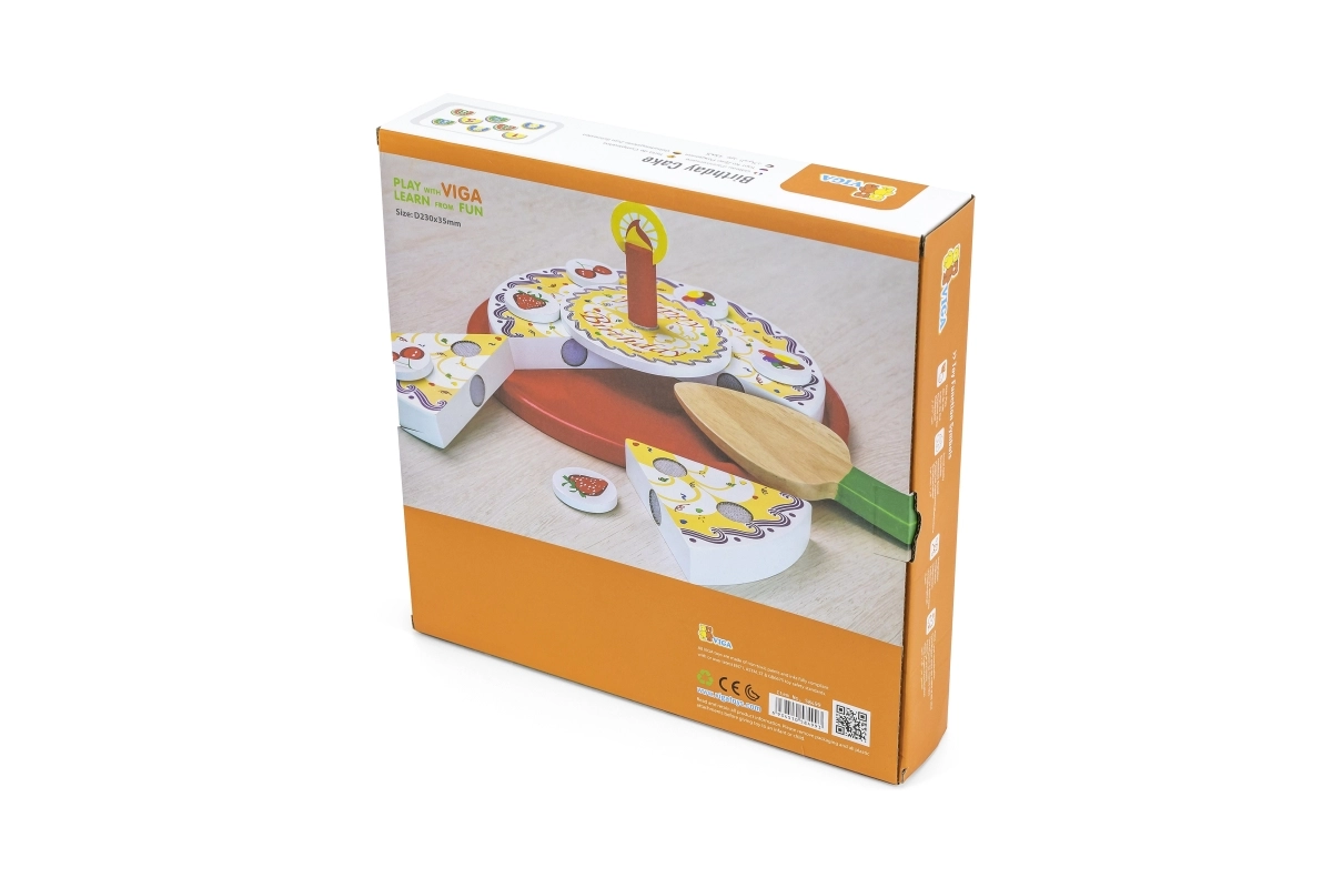 Stilīga koka griežamā kūka no zīmola VIGA bērniem no 18 mēnešiem sniedz stundām ilgu fantāzijas spēli. Krāsainās šķēles viegli “tiek sagrieztas” un atkal saliktas kopā, attīstot sīko motoriku, acu–roku koordināciju un sadarbību dzimšanas dienas svinību rotaļās.