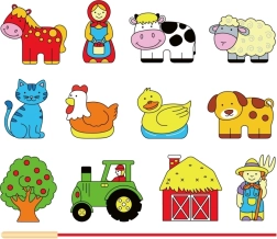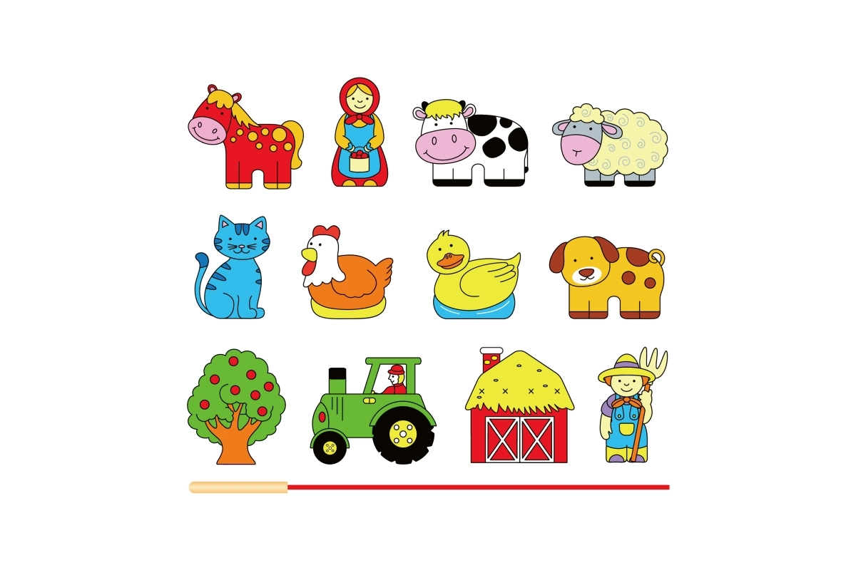 Klucīši attēlo dažādas lauksaimniecības figūras, piemēram, dzīvniekus, traktoru, šķūni un citus, veicinot radošu spēli un stāstu veidošanu.