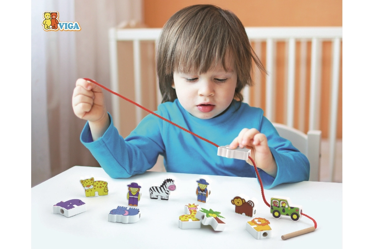 Komplektā ir krāsaini koka klucīši un aukla, kas māca bērniem veiklību un pacietību, verot klucīšus.