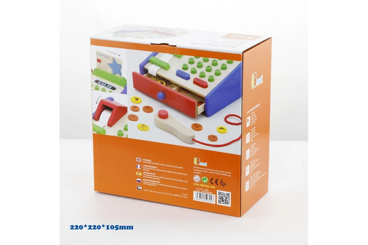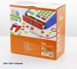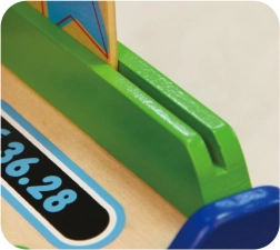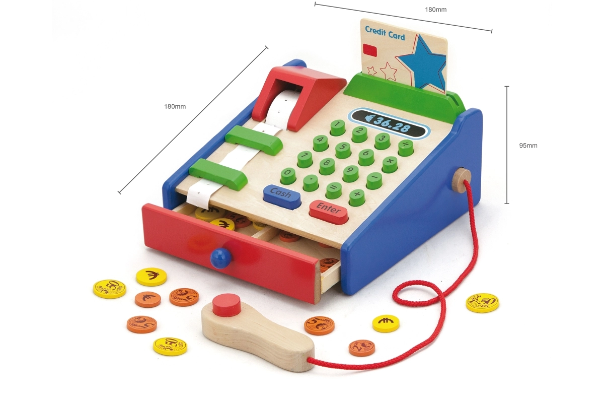 Šī krāsainā koka kase bērniem piedāvā reālistisku iepirkšanās pieredzi – pogu spiešana, “skaidrās naudas” atvilktnes atvēršana, norēķini ar karti vai skeneri un “čeku” drukāšana. Pateicoties pārdomātiem piederumiem, bērni viegli trenē skaitīšanu, komunikāciju un sadarbību.