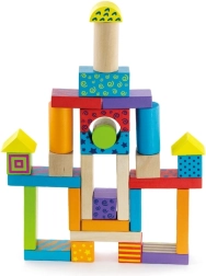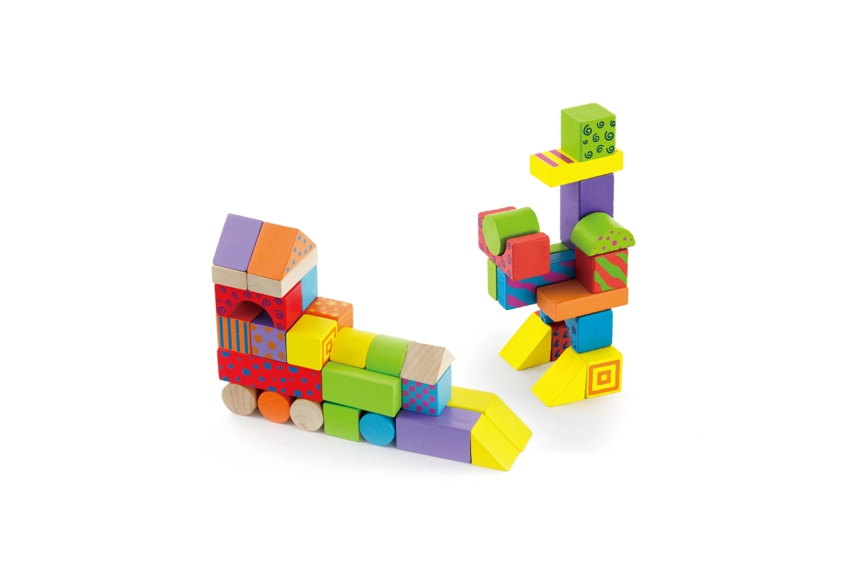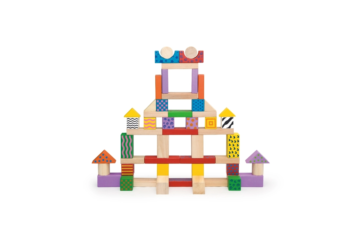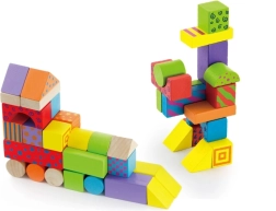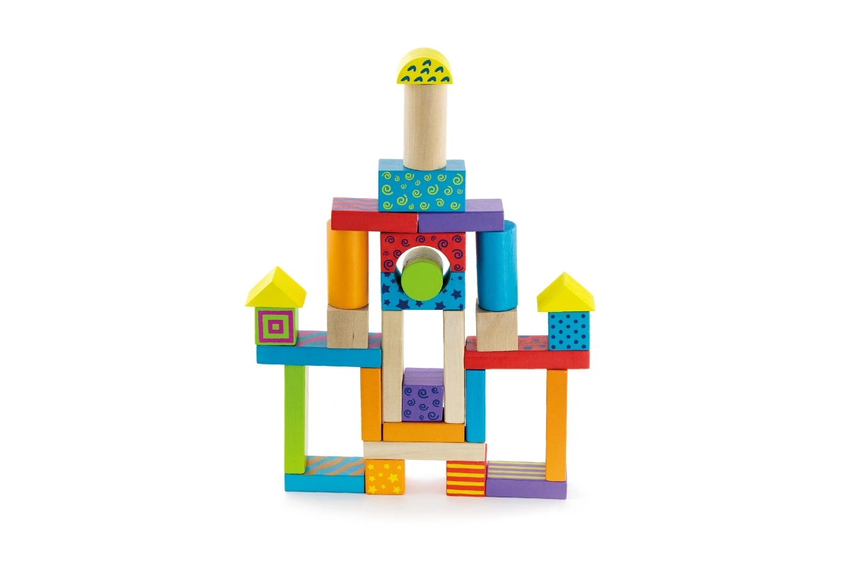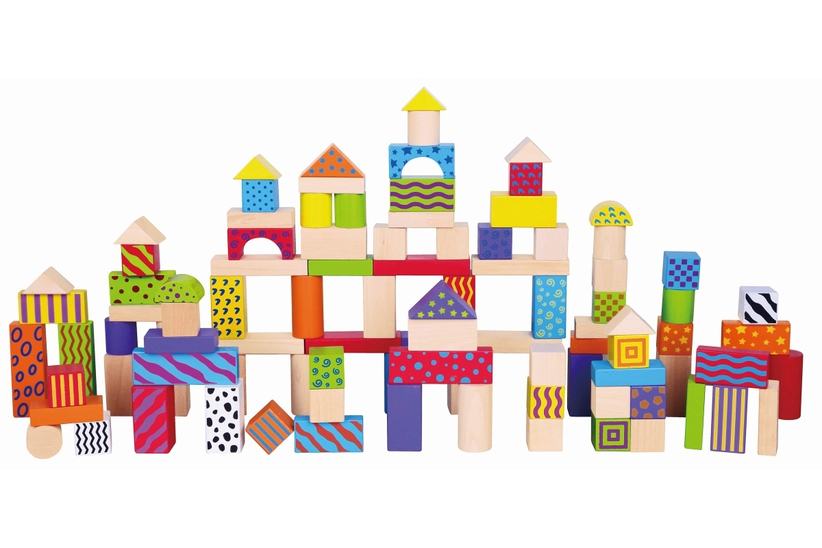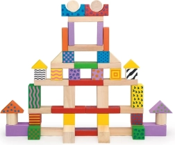 Šis laikmetīgais koka klucīšu komplekts sniedz bērniem stundām ilgu, jēgpilnu izklaidi. Pateicoties 100 košajām detaļām dažādās formās, var celt torņus, mājas un pat veselas pilsētiņas, vienlaikus attīstot acu–rokas koordināciju, loģisko domāšanu un pacietību.