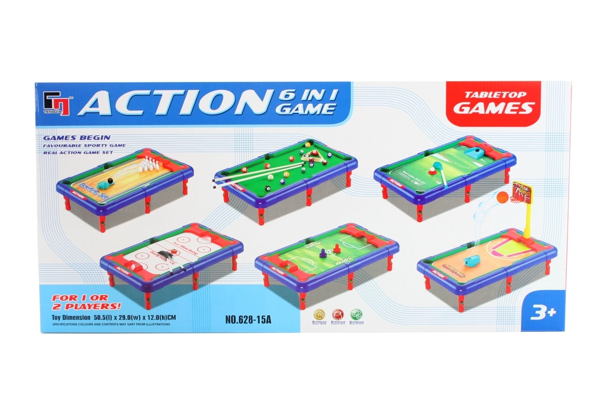 Šis daudzfunkcionālais galdspēļu sporta komplekts apvieno sešas populāras spēles vienā praktiskā risinājumā. Kompaktie izmēri iederas uz jebkura galda, vienlaikus nodrošinot pietiekami daudz vietas dinamiskai spēlei. Bērni var viegli izmēģināt dažādas disciplīnas un trenēt precizitāti, ātras reakcijas un komandas darbu.