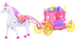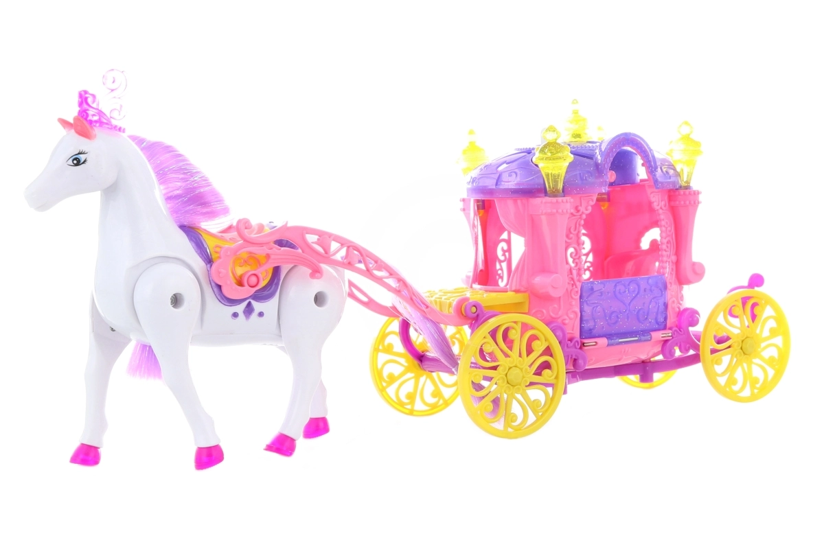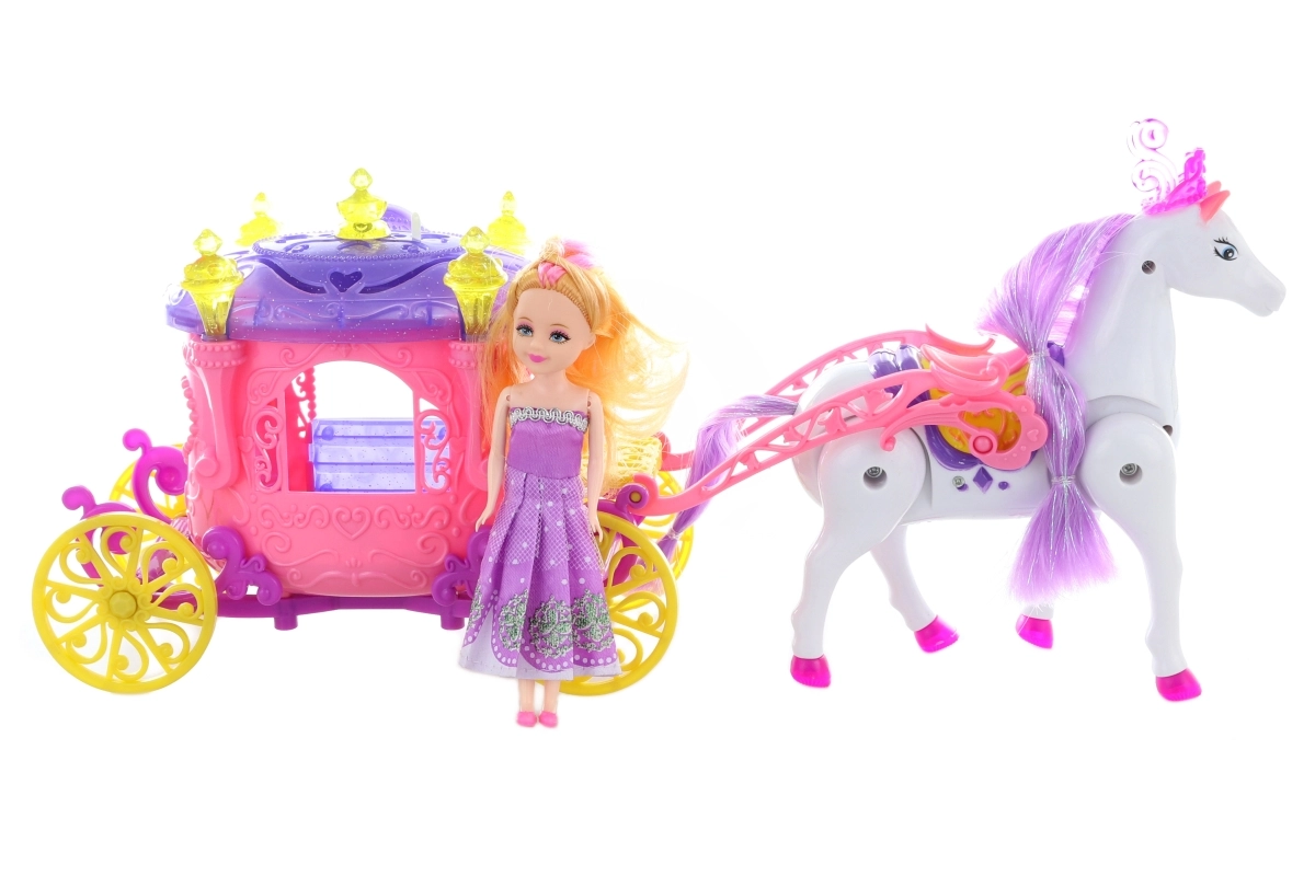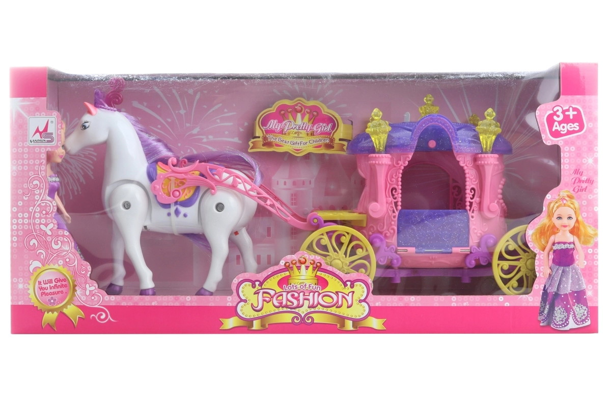 Piedāvājam lielisku komplektu Zirgs ar ratiņiem lellēm, kas sagādās prieku un izklaidi visiem bērniem. Šis interaktīvais komplekts ietver zirgu, kas pēc 2 AA bateriju ievietošanas (nav iekļautas komplektā) staigā un izdod skaņas, kā arī skaistus ratiņus, kas spīd ar 3 AG13 baterijām (nav iekļautas komplektā). Turklāt komplektā ir arī mīlīga lelle aptuveni 13 cm izmērā, kas padara šo komplektu par lielisku papildinājumu bērnu spēlēm.