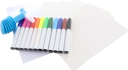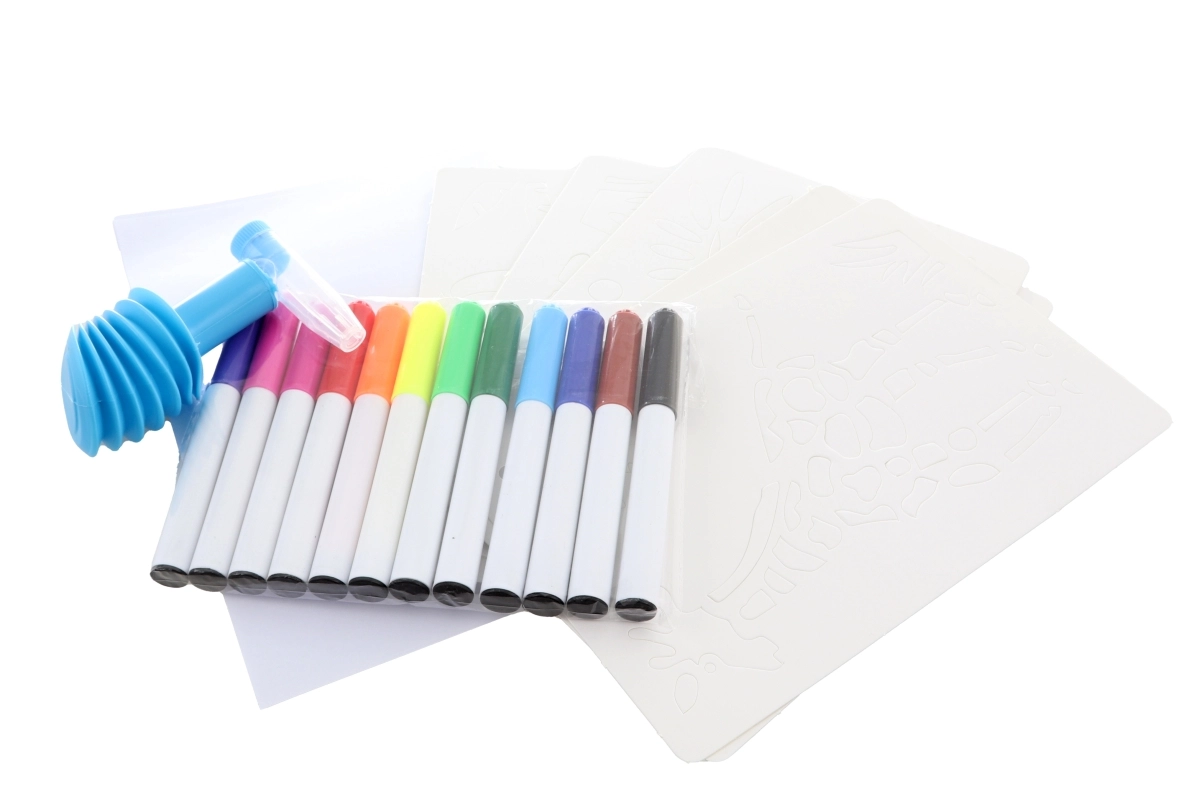 12 krāsaini flomāsteri, 8 trafareti, 6 papīra lapas, kartona statīvs ar turētāju, pūšanas uzgalis ar pumpīti