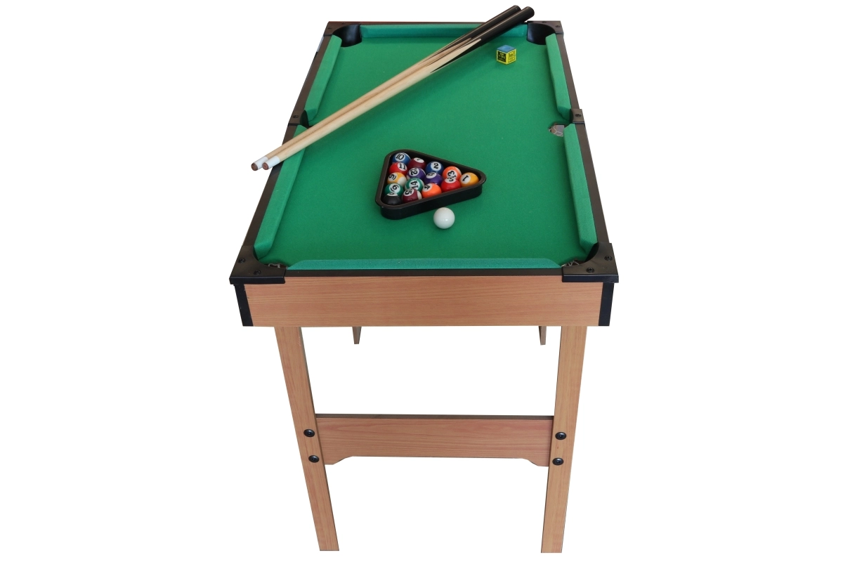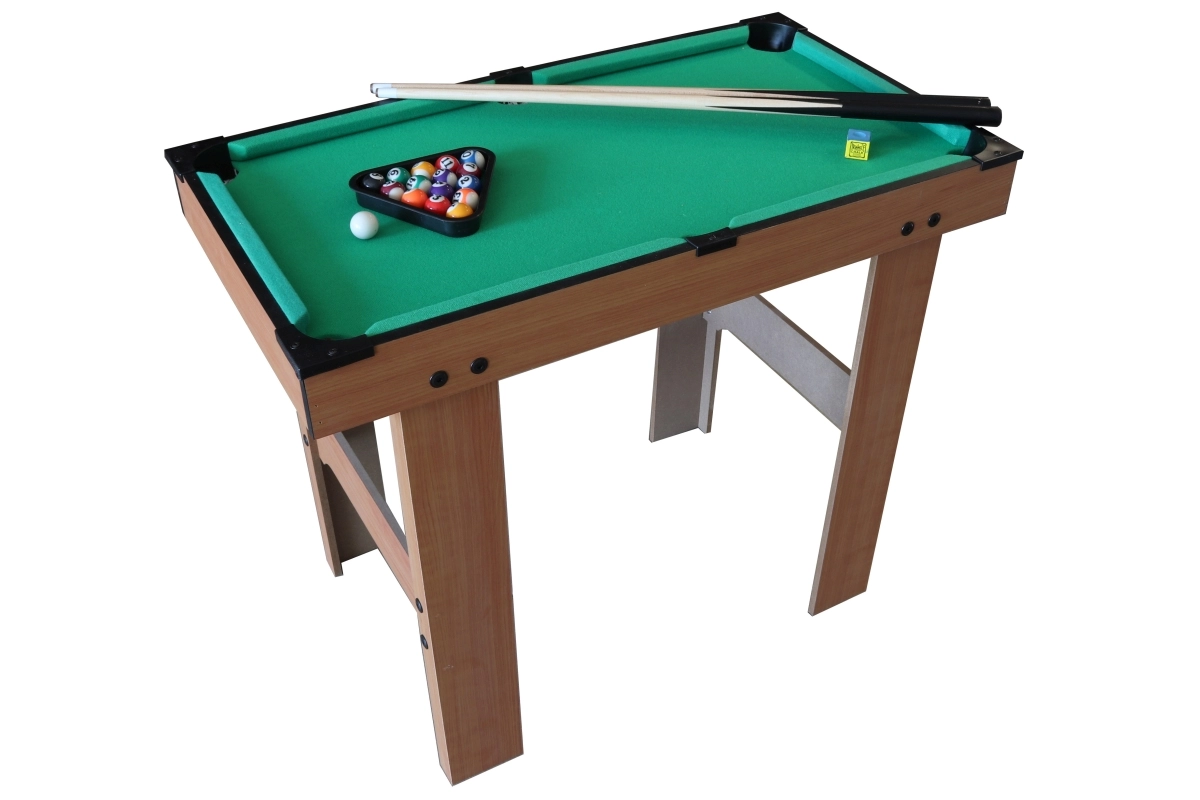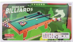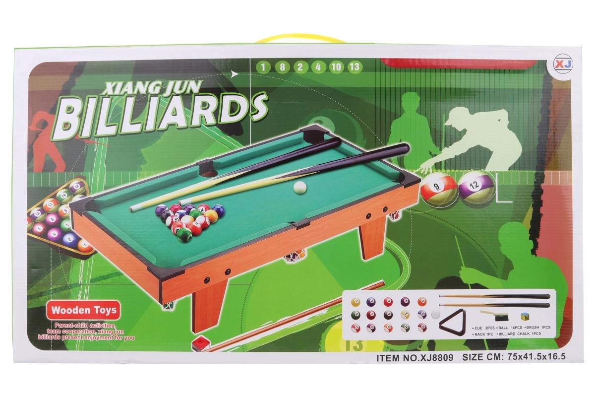 Kompakts bērnu biljards kvalitatīvā koka izpildījumā sniedz lielisku izklaidi gan mazajiem, gan lielākiem spēlētājiem. Komplektā ir 2 kijas, 16 biljarda bumbas un pilns piederumu komplekts. Pateicoties izmēriem, tas ir ideāli piemērots bērnu istabai un pirmajai iepazīšanai ar spēles noteikumiem.