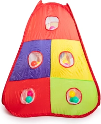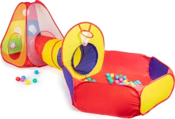 Izklaidējošs bērnu rotaļu komplekts ar krāsainu telti, tuneli un sauso bumbiņu baseinu spēlēm mājās vai dārzā. Komplektā ietilpst 100 krāsainas bumbiņas, metamais grozs un mērķa sienas ar 3 Velcro bumbiņām. Pašizvelkama konstrukcija, ātra montāža un viegls poliestera pārvalks nodrošina vienkāršu lietošanu un ilgas aktīvas izklaides stundas.