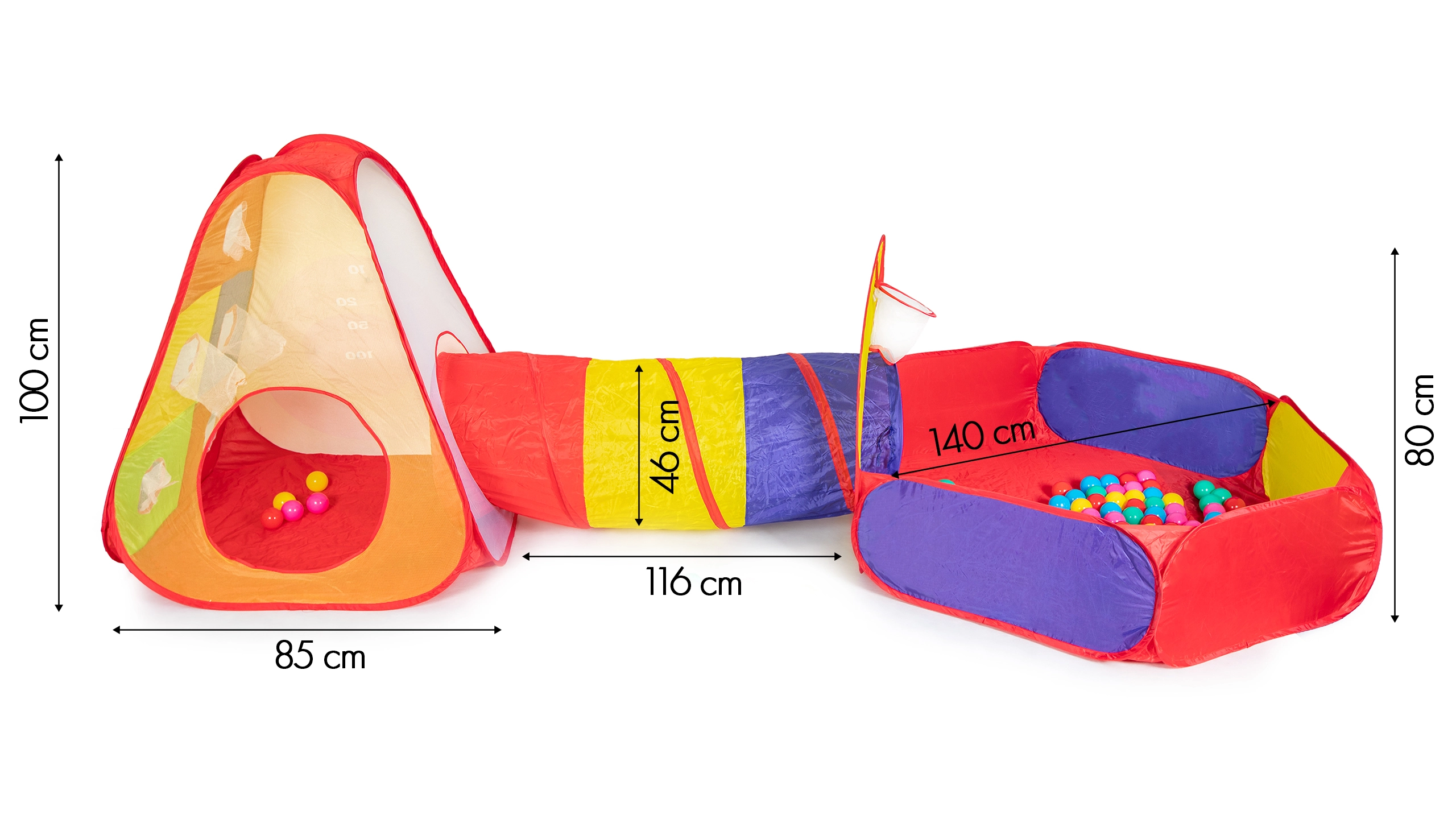 - Pilns komplekts: telts + tunelis + sausais baseins + 100 bumbiņas + 3 Velcro bumbiņas