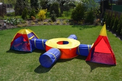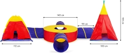 Bērniem patiks rāpot cauri 4 tuneļiem, paslēpties iglu un izveidot slepenu bāzi tipi ar lodziņu un aizveramu ieeju. Apaļais centrs ar augšējo ventilāciju savieno visas daļas un veicina komandas rotaļas. Izturīga poliestera materiāls lieliski piemērots ikdienas lietošanai mājās, uz terases vai dārzā.