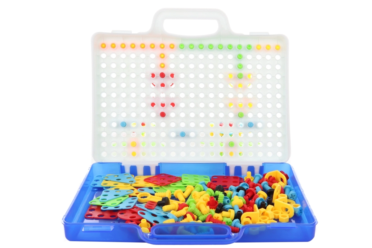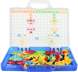 Viss ir ievietots pārnēsājamā koferītī ar vāku, kas kalpo kā pegboard perforētā plāksne, tāpēc komplektu ir vienkārši pārnēsāt un sakārtot. Lielisks palīgs motorikas, acu–roku koordinācijas, radošuma un pacietības attīstībai.