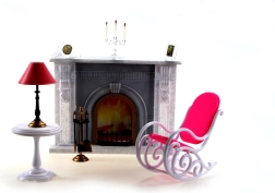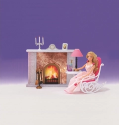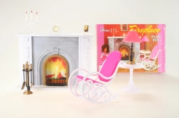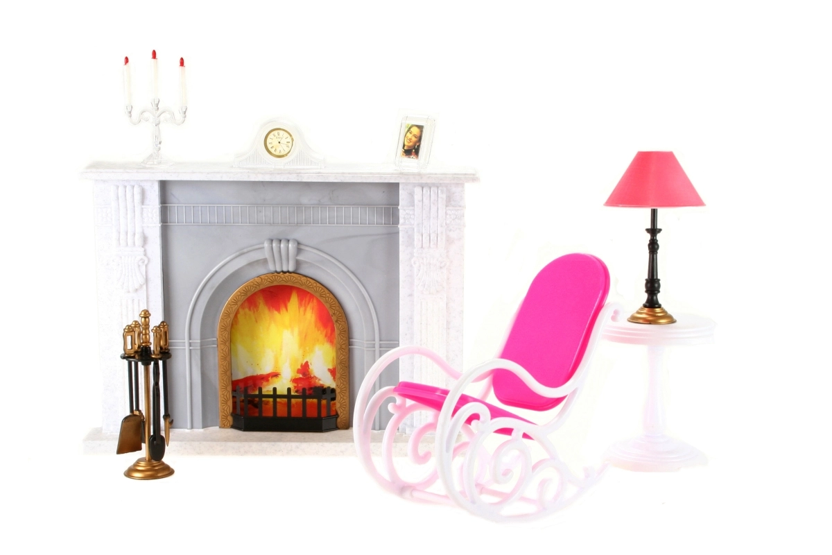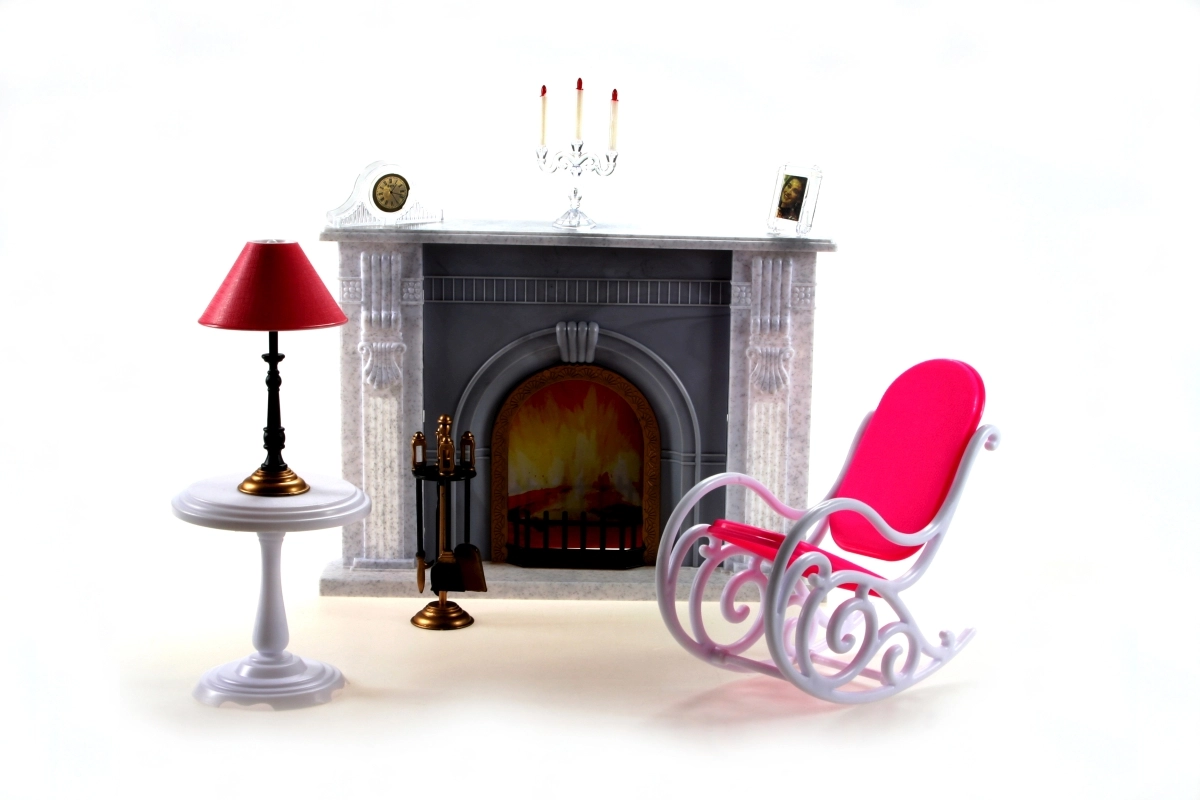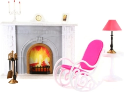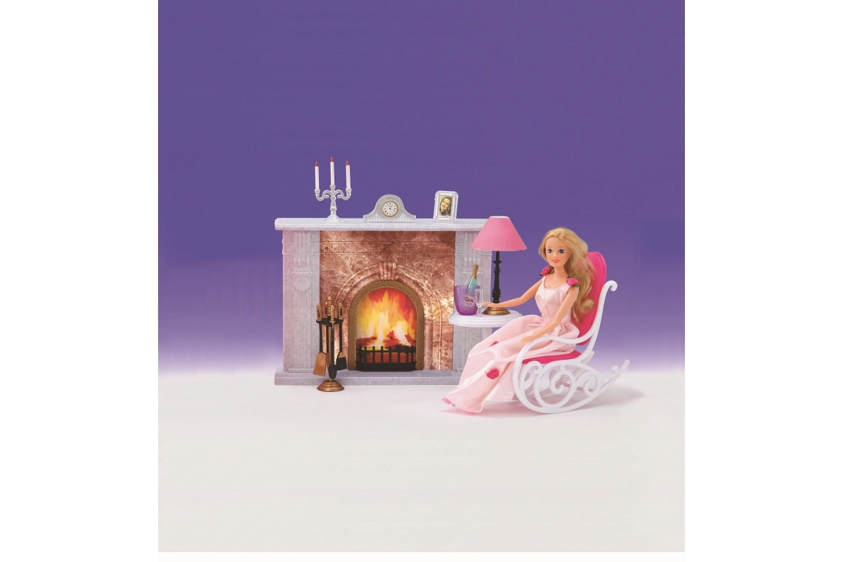 Komplektā ietilpst šūpuļkrēsls ērtai leļļu atpūtai, galdiņš ar dekoratīvu (nedarbojošos) lampu un stends ar kamīna piederumiem. Pilnvērtīgu atmosfēru rada dekorācijas: svečturis, bilde un pulkstenis. Pateicoties plastmasas izpildījumam, komplekts ir viegls, viegli kopjams un drošs bērniem.