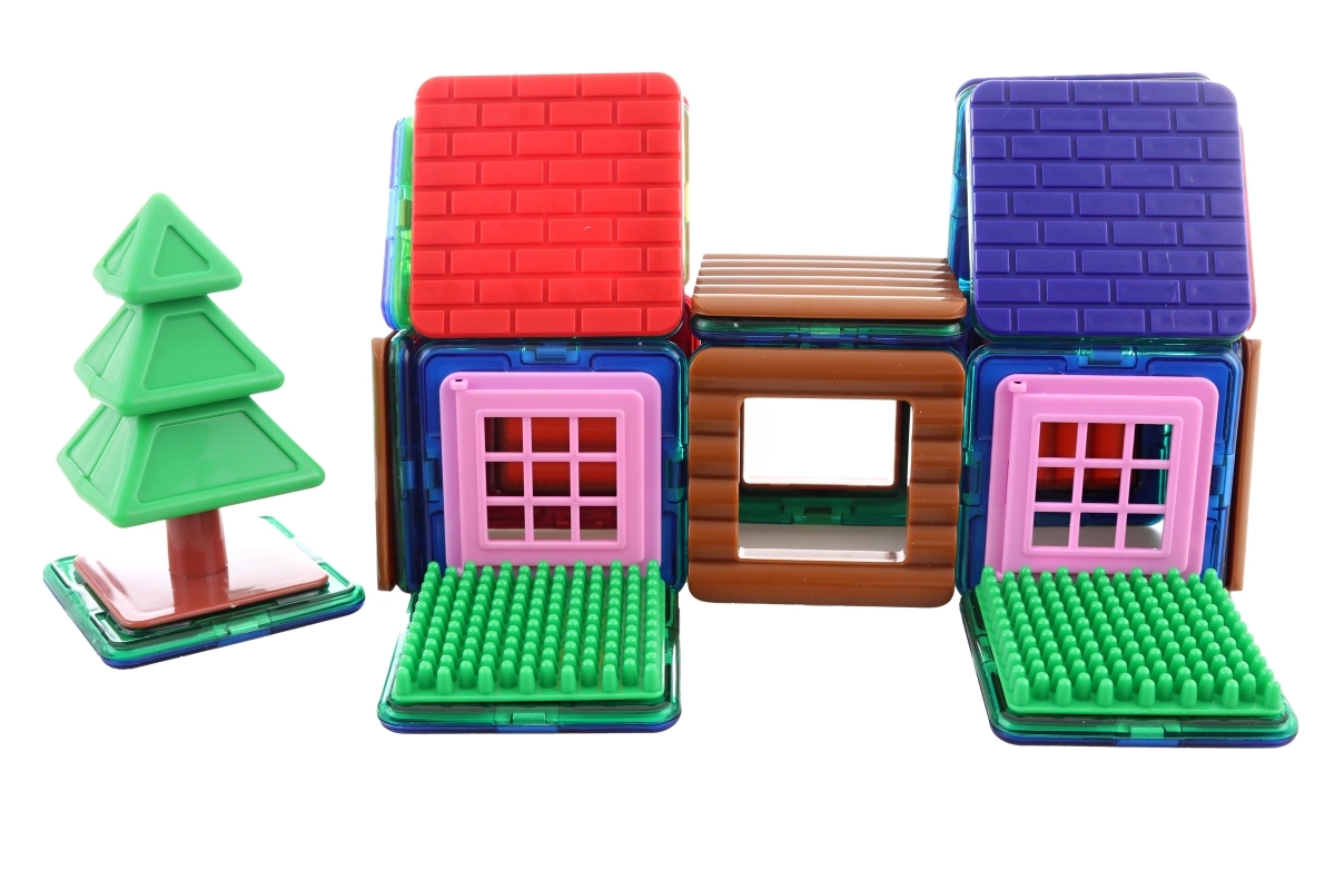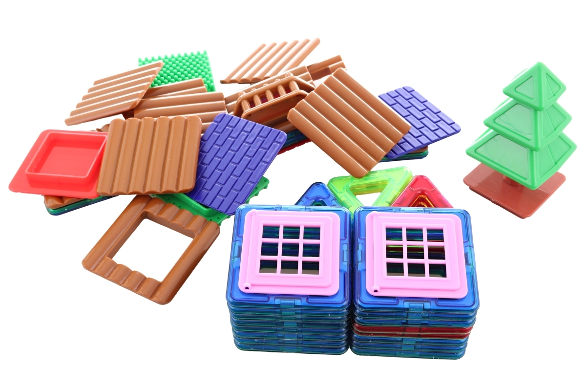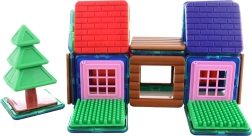 48 krāsainas magnētiskās detaļas ļauj bērniem celt mājiņas, torņus un oriģinālus modeļus, attīstot fantāziju katrā spēlē.