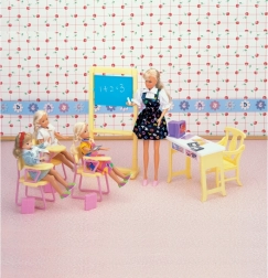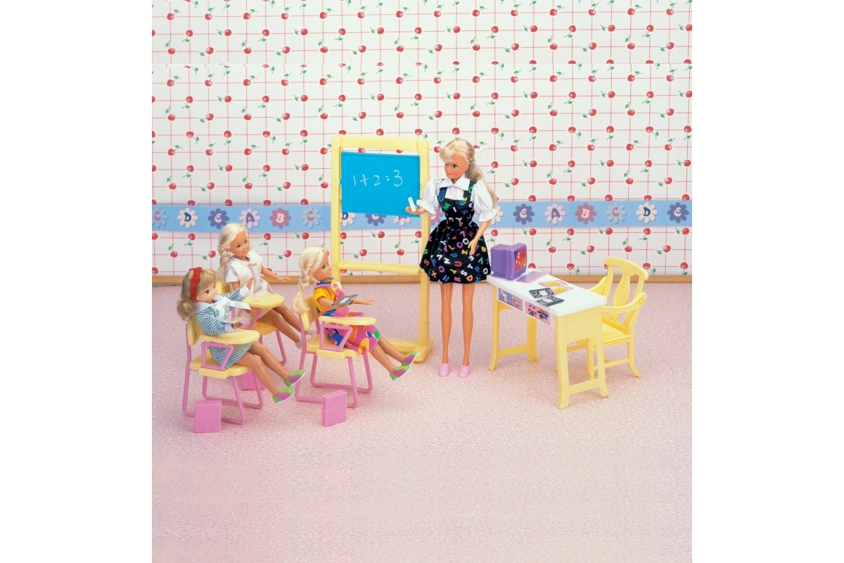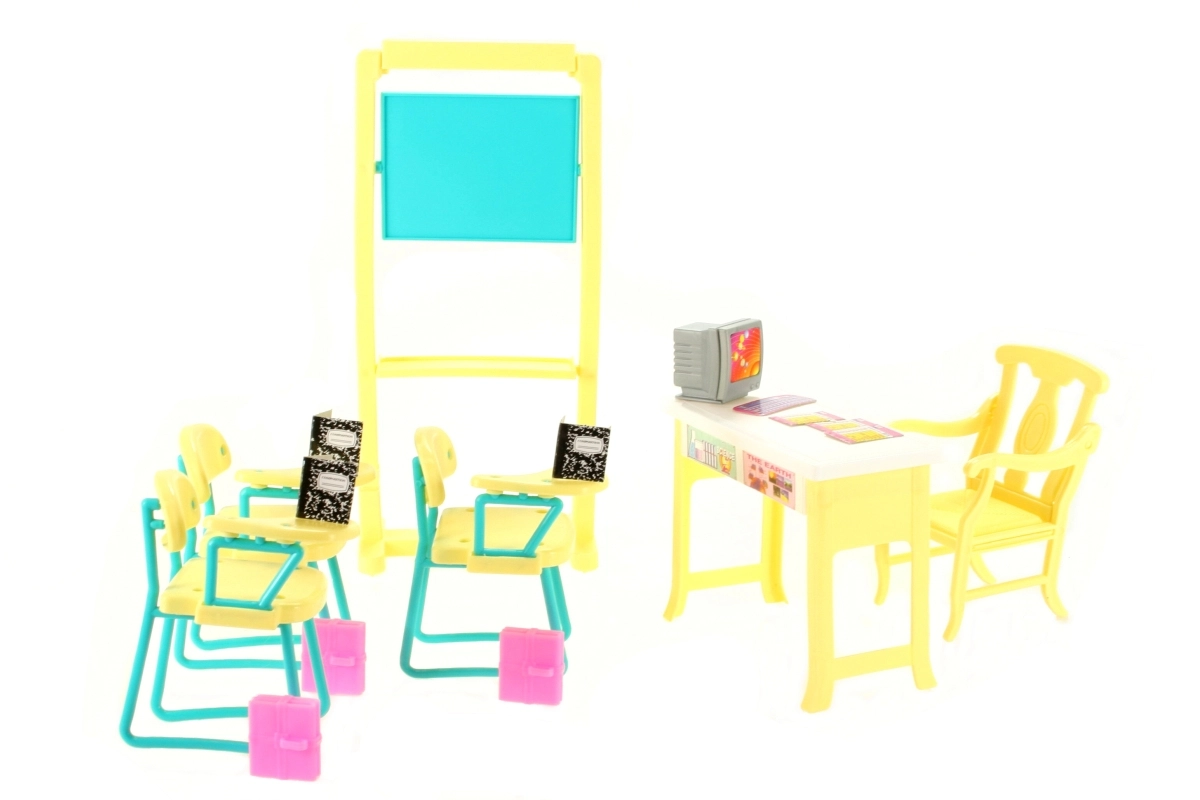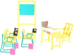 Komplektā ir ietverta plaša tāfele, skolotāja stūrītis ar datoru un krēsli skolēniem. Pateicoties kompaktajiem izmēriem, sets ir saderīgs ar standarta lellēm un to ir viegli uzglabāt.