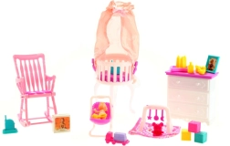 Šis bagātīgi aprīkotais komplekts pārvērš katru rotaļu reālistiskā pieredzē. Bērni var iekārtot savu zīdaiņa stūrīti, salikt sīklietas kumodē, iemidzināt zīdaini gultiņā ar baldahīnu un šūpoties stilīgā krēslā. Komplekts lieliski veicina radošu spēli, sīko motoriku un lomu spēles.