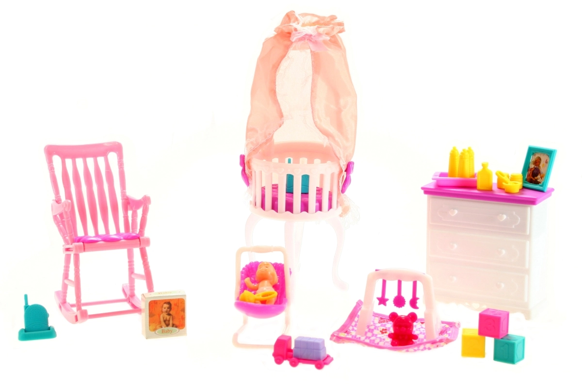 - Pilns aprīkojums: kumode, gultiņa ar baldahīnu, atpūtas krēsliņš, šūpuļkrēsls, rotaļlietas un piederumi zīdainim.
