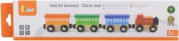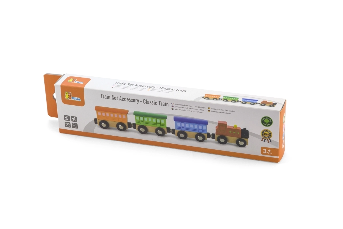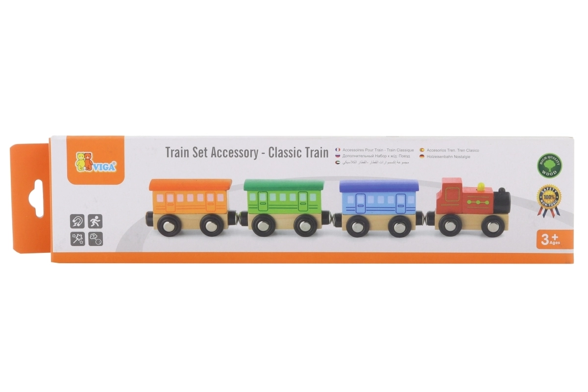 Koka komplekts Klasisks vilcieniņš sastāv no 4 daļām, kuras savienotas ar magnētiem. Rotaļlietu izstrādājis atzīts koka rotaļlietu ražotājs Viga Toys. Komplektu var izmantot kā patstāvīgu rotaļlietu vai kā papildinājumu citām vilcienu trasēm, konstruktoriem un komplektiem.