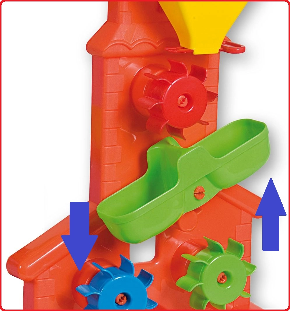 Šīs izturīgās dzirnaviņas ir lielisks pavadonis smilšukastē un pie ūdens. Bērni var bērt smiltis vai lēt ūdeni plašajā piltuvē ar regulāciju un vērot, kā trīs krāsainie riteņi atdzīvojas un griežas. Sadalošais renītis palīdz virzīt plūsmu un rosina eksperimentēt.
