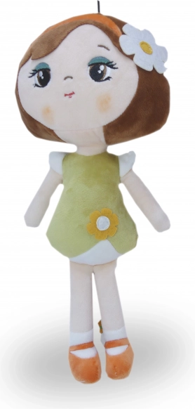 Plīša lelle Roma apbur ar maigu izskatu – brūni matiņi ar ziedu rotu, olīvzaļa kleita ar ziediņu un oranžas kurpītes. Smalkais, gludais un spīdīgais plīšs ir patīkams pieskārienam un aicina uz mīļošanos. Pateicoties vieglajai konstrukcijai, bērni to viegli paņems līdzi jebkur – gultiņā, ceļojumos vai ciemos.