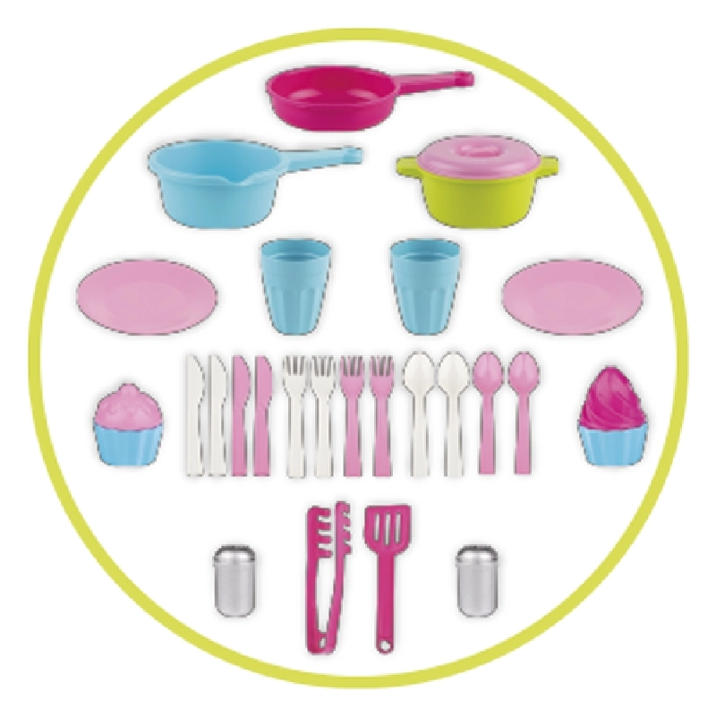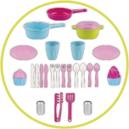 Galda piederumi 4 bērniem, 3 katli, 2 glāzes, 2 šķīvji, 2 knaibles, sāls trauciņš, piparu trauciņš, 2x cupcake