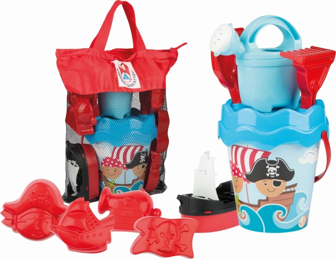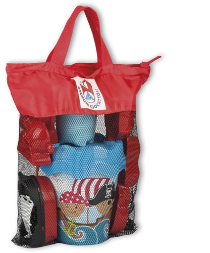 - Spainis (Ø 17 cm), sietiņš, lejkanna 0,5 l, lāpstiņa, grābeklītis, pirātu laiviņa, 4 formiņas