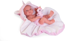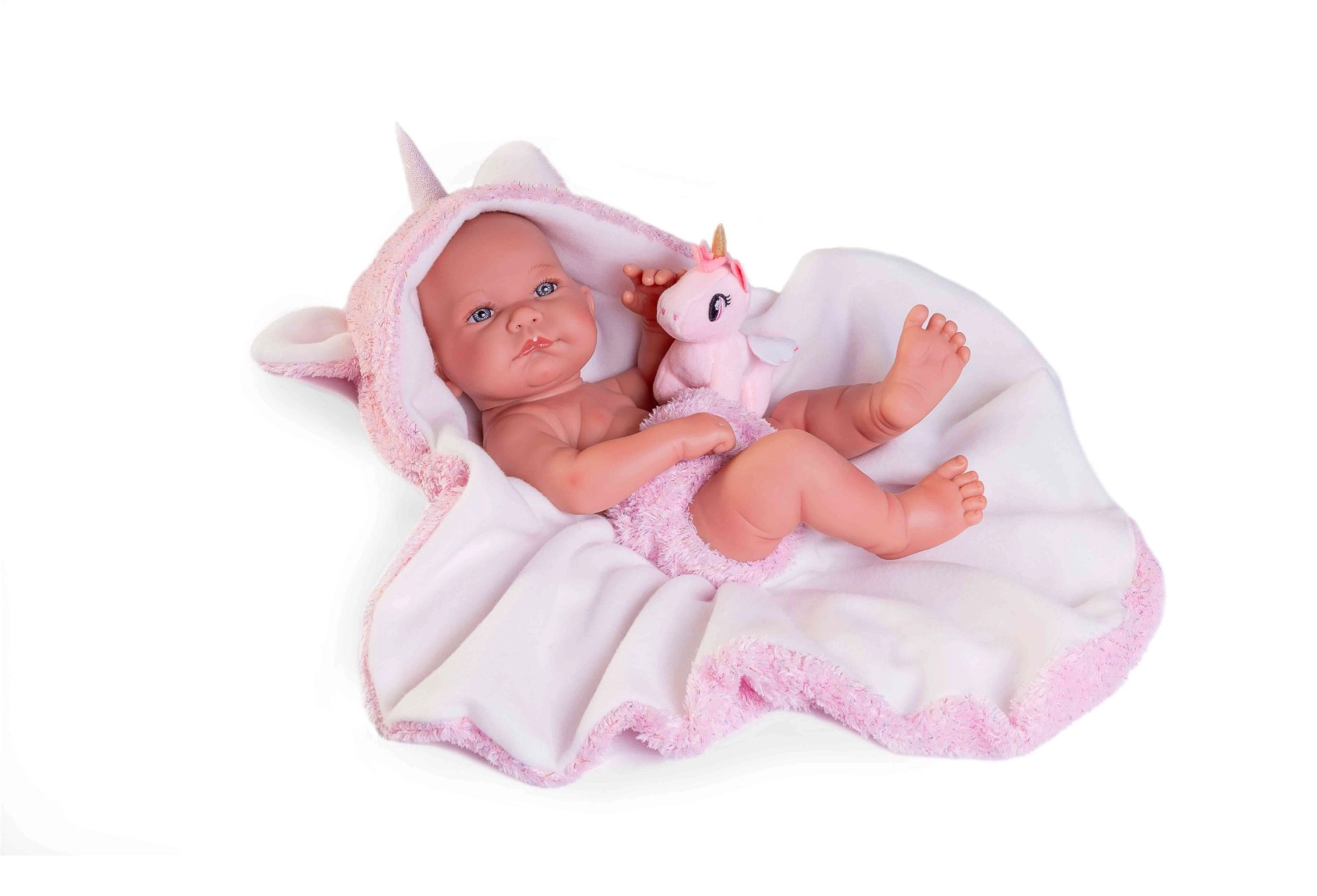 Rokām darināta spāņu lelle – jaundzimušais ar pilnībā vinila ķermeni un realistiskiem sīkumiem, tostarp anatomiski pareizu attēlojumu. Izgatavota no mīkstināta vinila, patīkama taustei, piemērota peldināšanai. Izmērs 42 cm, dāvanu iepakojums, vecums 3+.