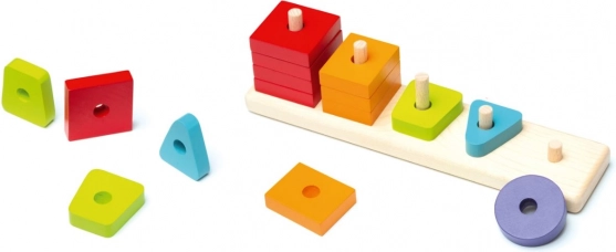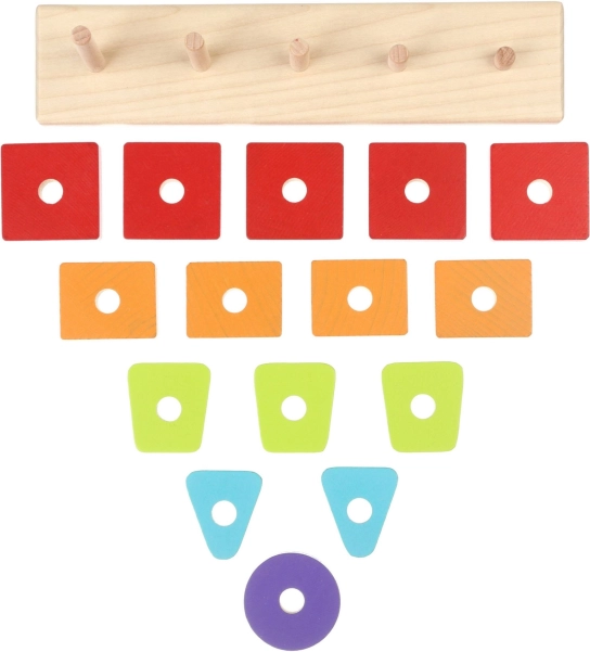 Pateicoties dažādām ģeometriskām detaļām un atkārtojošām krāsām, bērni viegli apgūst šķirošanu, pārošanu un pareizu novietošanu uz pamatnes tapām.