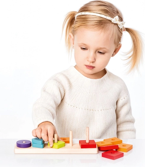 Formu uzvilkšana uz tapām veicina acu–roku koordināciju, pacietību un koncentrēšanos, ideāla nodarbe bērniem no 18 mēnešiem.