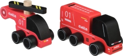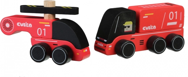 Koka komplekts CUBIKA ugunsdzēsēji ietver vienu ugunsdzēsēju auto un vienu helikopteru, izgatavotus no kvalitatīva bērza un kļavas. Pateicoties noapaļotām malām un drošām ūdens bāzes krāsām, tas ir ideāli piemērots bērniem no 3 gadu vecuma. Sertifikāti TÜV un Eiropas standarts EN 71 nodrošina augstu drošības līmeni. Ražots Eiropā. Auto garums 12 cm, helikoptera 10 cm.
