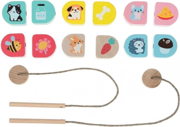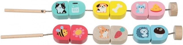 12 koka savēramie elementi (6 pāri), 2 aukliņas ar koka stienīti un stopieri