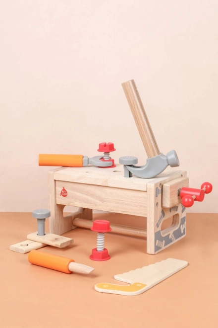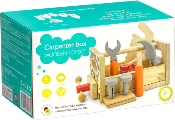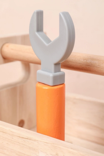 Komplektā ir daudzveidīgi bērnu instrumenti: āmurs, zāģis, skrūvgriezis, atslēga, skrūves un uzgriežņi, skava un gludas koka detaļas ar caurumiem. Katram priekšmetam ir sava vieta, tāpēc bērni apgūst kārtību un pamatprasmes darbā ar stiprinājumiem. Spēle veicina radošu būvēšanu, roku–acu koordināciju un pacietību.