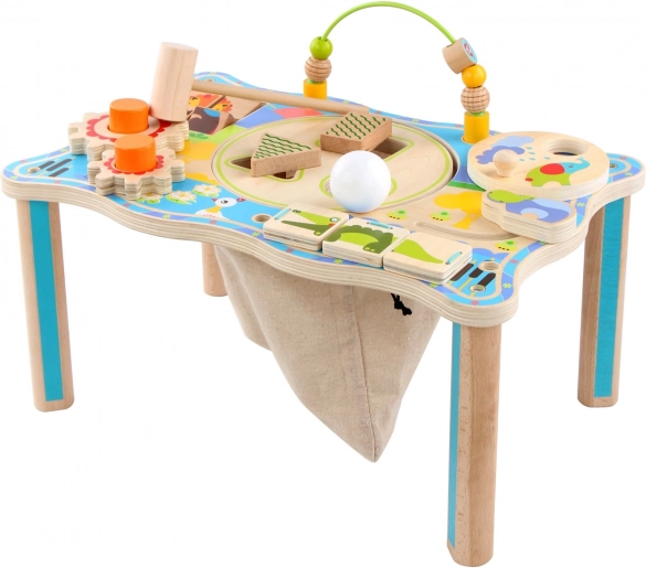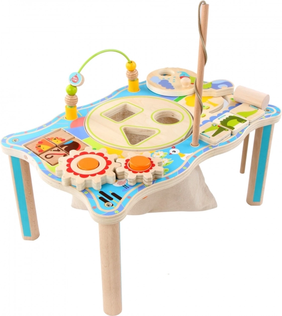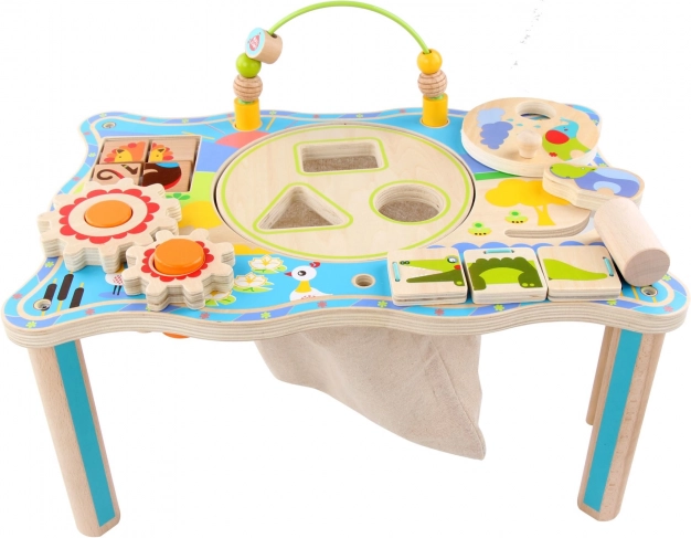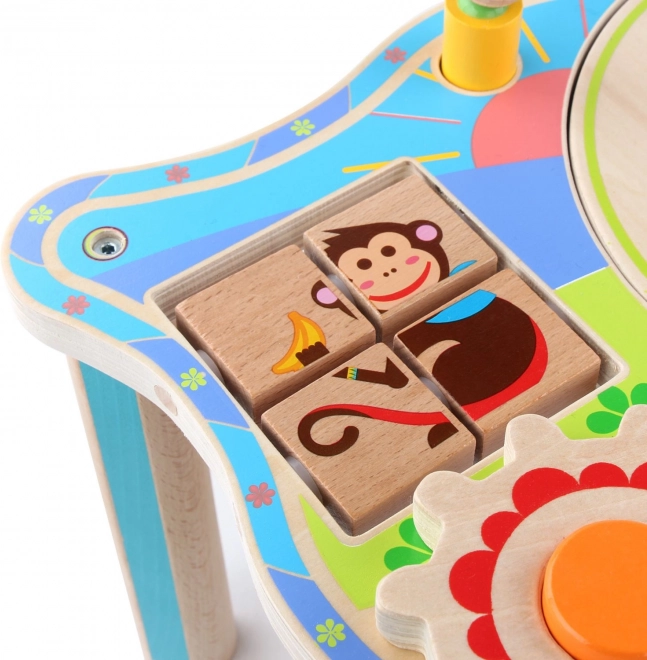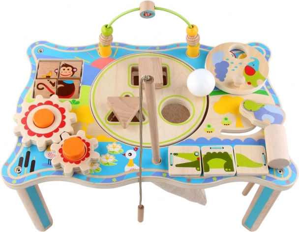 Koka galdiņš ar džungļu motīviem apvieno izklaidi ar mācīšanos un palīdz attīstīt sīko motoriku, roku–acu koordināciju un loģisko domāšanu. Bērni var griezt zobratus, pārvietot krelles pa trasi, trenēt spēku un koncentrēšanos ar sitamajiem tapas klucīšiem un vingrināt formu atpazīšanu, izmantojot šķirotāju. Centrā atrodas lina maisiņš noķertajām zivtiņām un spēļu detaļām, kas palīdz uzturēt kārtību spēles laukumā.